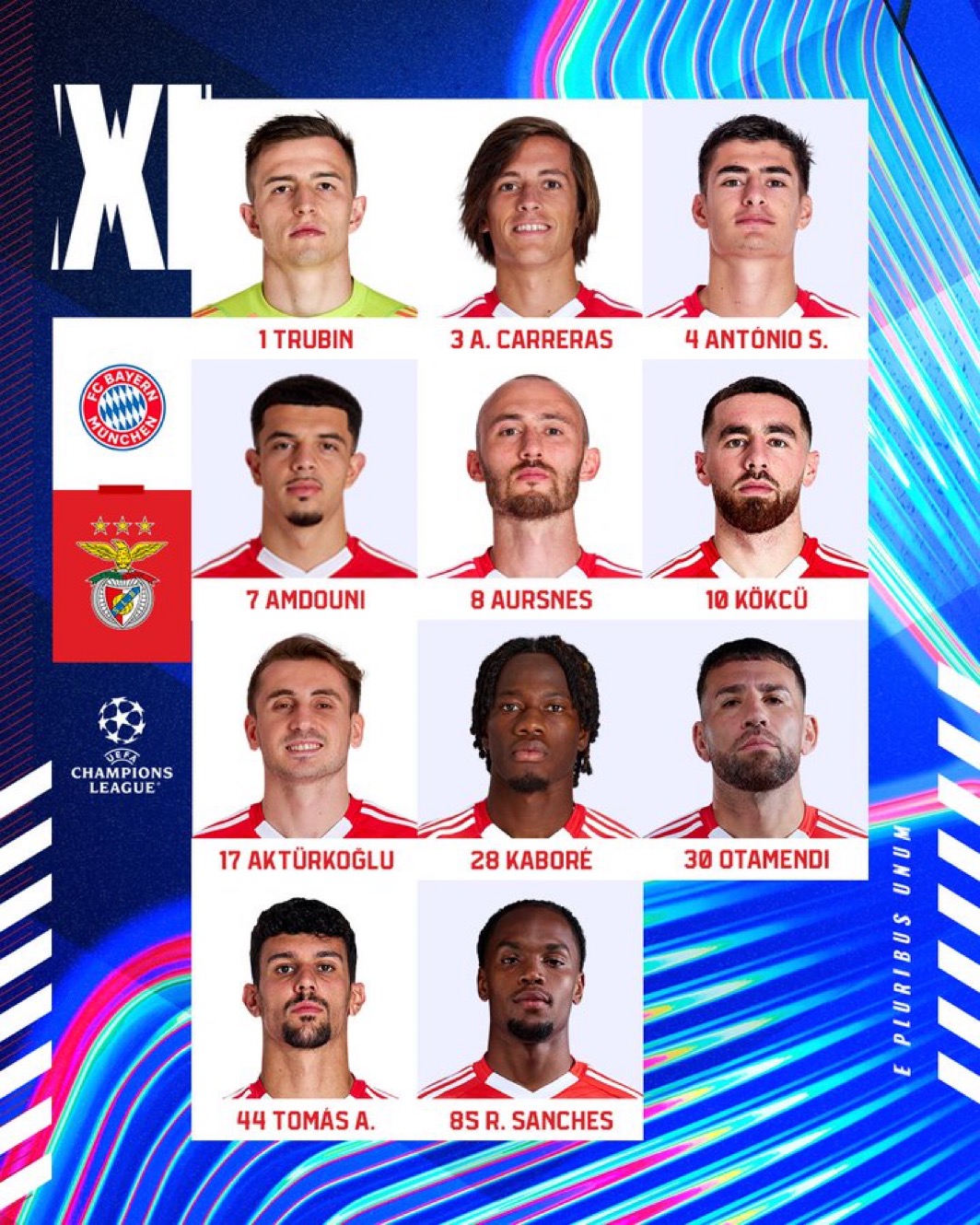 وجاء تشكيل فريق بنفيكا البرتغالي أمام بايرن ميونخ كالتالي: