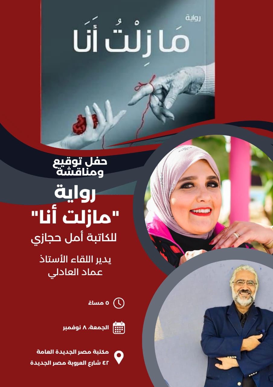تنظم مكتبة مصر الجديدة العامة فى الخامسة من مساء غد الجمعة حفل توقيع ومناقشة رواية "ما زلت أنا" للكاتبة أمل حجازي.