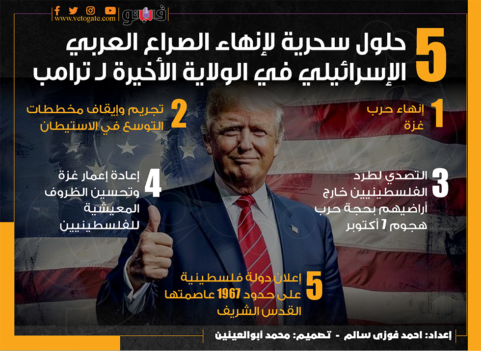 5 حلول سحرية لإنهاء الصراع العربي الإسرائيلي في الولاية الأخيرة لـ ترامب (إنفوجراف) الجمعة 08/نوفمبر/2024 - 10:52 م 11/8/2024 10:52:34 PM ترامب، فيتو احمد فوزى سالم شارك طباعة 18 حجم الخط شارك طباعة ترامب الاحتلال الإسرائيلي الاحتلال الصراع العربي الاسرائيلي إنهاء الإحتلال إنهاء الاحتلال الإسرائيلي دولة فلسطينية دولة فلسطين معبر رفع