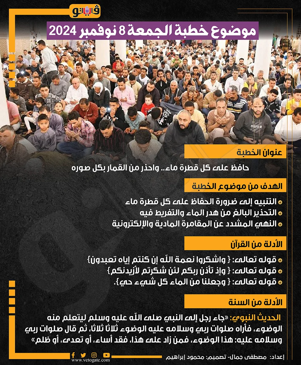 "حافظ على كل قطرة ماء.. واحذر من القمار بكل صوره"، موضوع خطبة اليوم الجمعة