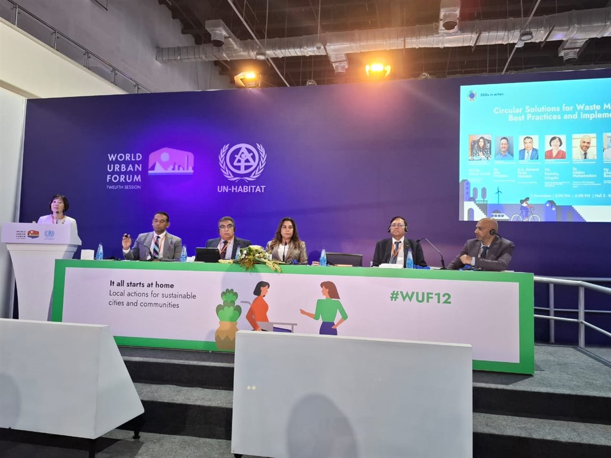 جاءت كلمة محافظ الدقهلية كمتحدث رئيسي في الجلسة التي ضمت إلى جانب مصر كلا من باكستان وكينيا والتي تهدف إلى مناقشة الحلول الدائرية لإدارة النفايات وتفعيل أهداف التنمية المستدامة من خلال أعمال المنتدى بالاشتراك مع منظمة الأمم المتحدة للمستوطنات البشرية بهدف تشجيع التعاون وتبادل المعرفة من خلال عرض قصص النجاح والمشروعات المنفذة في مختلف دول العالم.