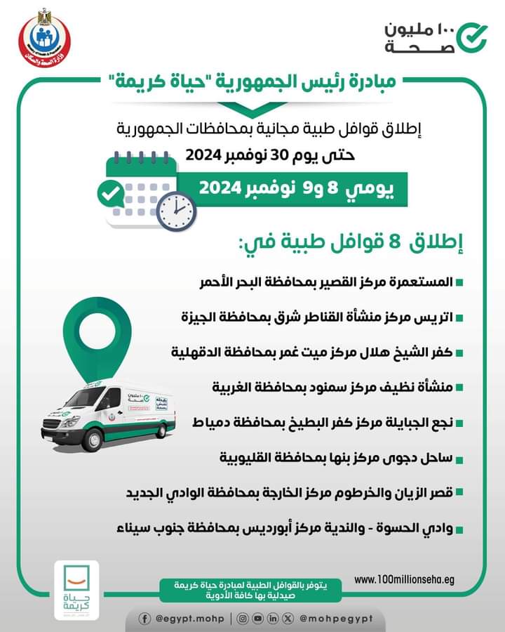 أعلنت وزارة الصحة إطلاق ٨ قوافل طبية ضمن مبادرة رئيس الجمهورية حياة كريمة يومي ٨ و٩ نوفمبر للكشف والعلاج مجانًا في التخصصات الطبية نساء وولادة - خدمات تنظيم الأسرة - الأطفال والباطنة - الأنف والأذن والعظام - الجراحة - الرمد الأسنان - القلب - الجلدية وخدمات الأشعة والتحاليل.