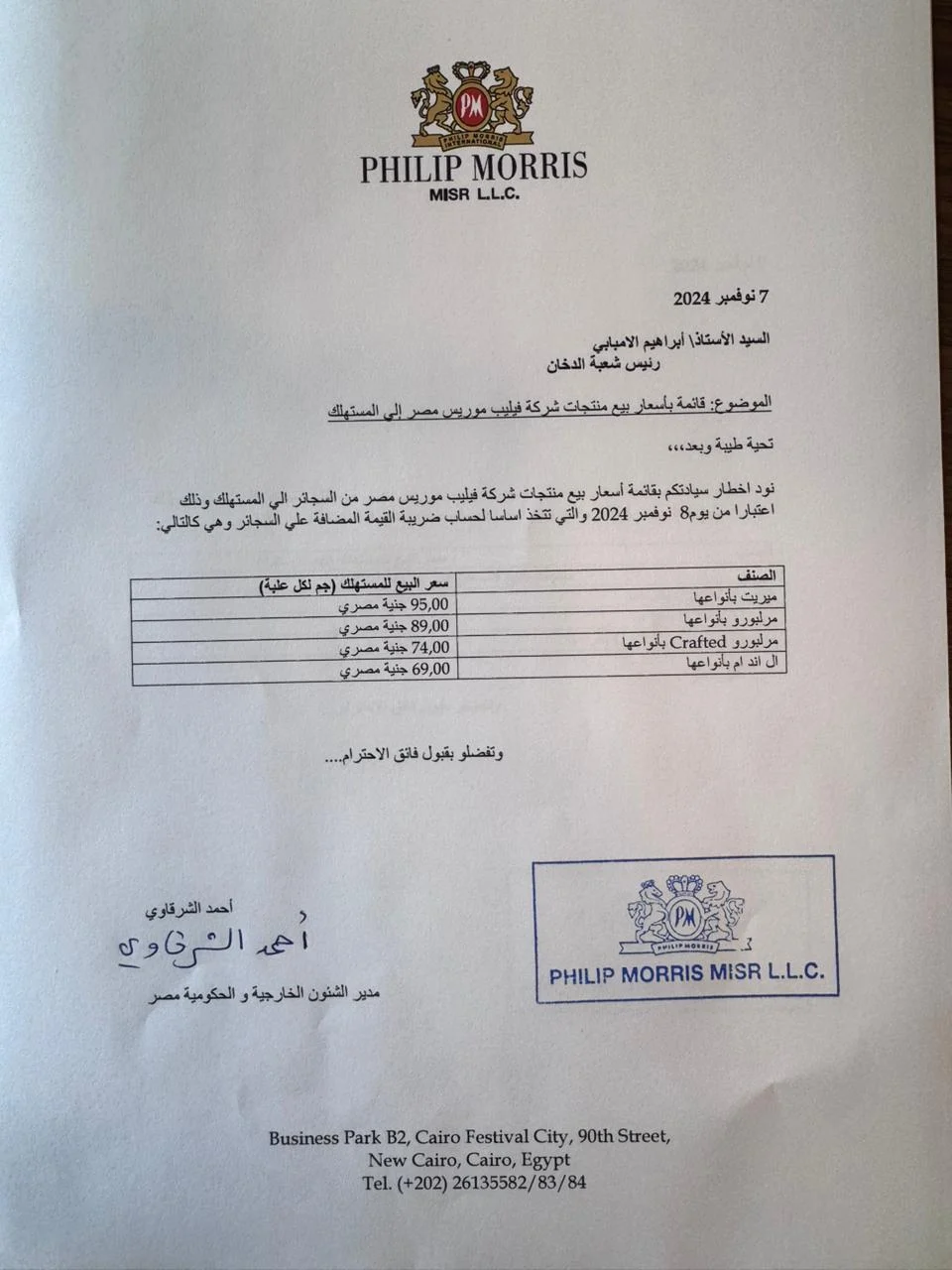 وأكدت شركة فيليب موريس مصر لجميع المدخنين ومستخدمي النيكوتين البالغين أن الأسعار الجديدة معلنة بشفافية على عبوات المنتجات من خلال رابط الاستجابة السريع "QR code" الذي تم وضعه على عبوات السجائر التقليدية ولفائف التبغ المسخن منذ عام ٢۰٢٢.