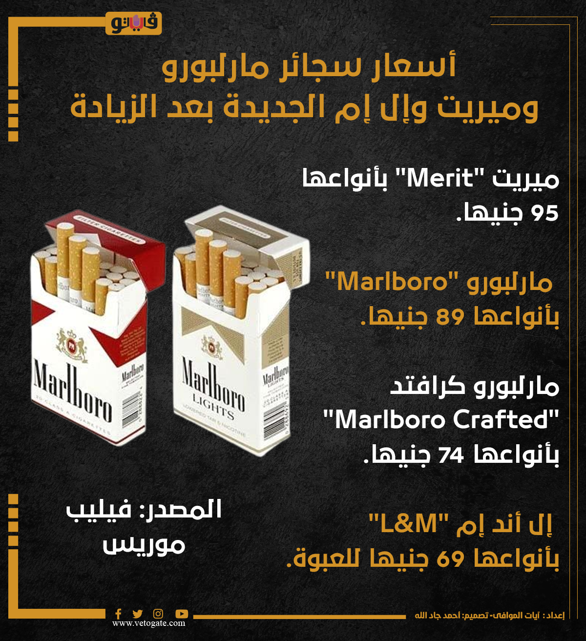 وأعلنت شركة فيليب موريس “مصر” قائمة الأسعار الجديدة لجميع منتجاتها من التبغ المُسخن "HEETS" و"TEREA"، والسجائر التقليدية من العلامات التجارية " Merit وMarlboro وL&M" بكافة أنواعهم والتي تبدأ من اليوم الجمعة 8 نوفمبر، حسب بيان الشركة الذي أصدرته.