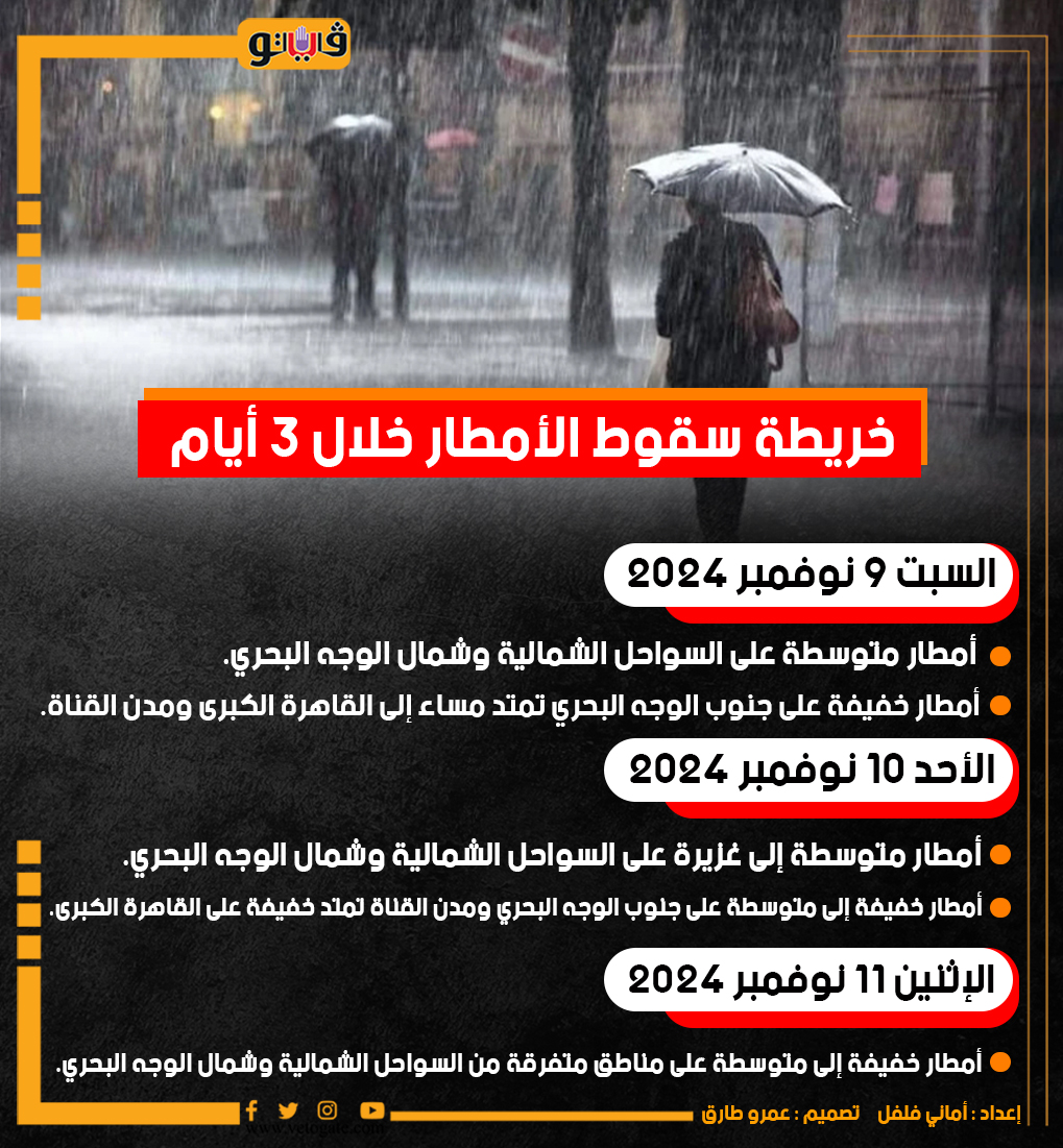 خريطة سقوط الأمطار خلال 3 أيام (إنفوجراف) السبت 09/نوفمبر/2024 - 09:12 ص 11/9/2024 9:12:58 AM خريطة سقوط الأمطار خلال 3 أيام، فيتو أماني فلفل تصميم :عمرو طارق شارك طباعة 18 حجم الخط شارك طباعة الأرصاد الجوية الأمطار الغزيرة أمطار متوسطة إلى غزيرة