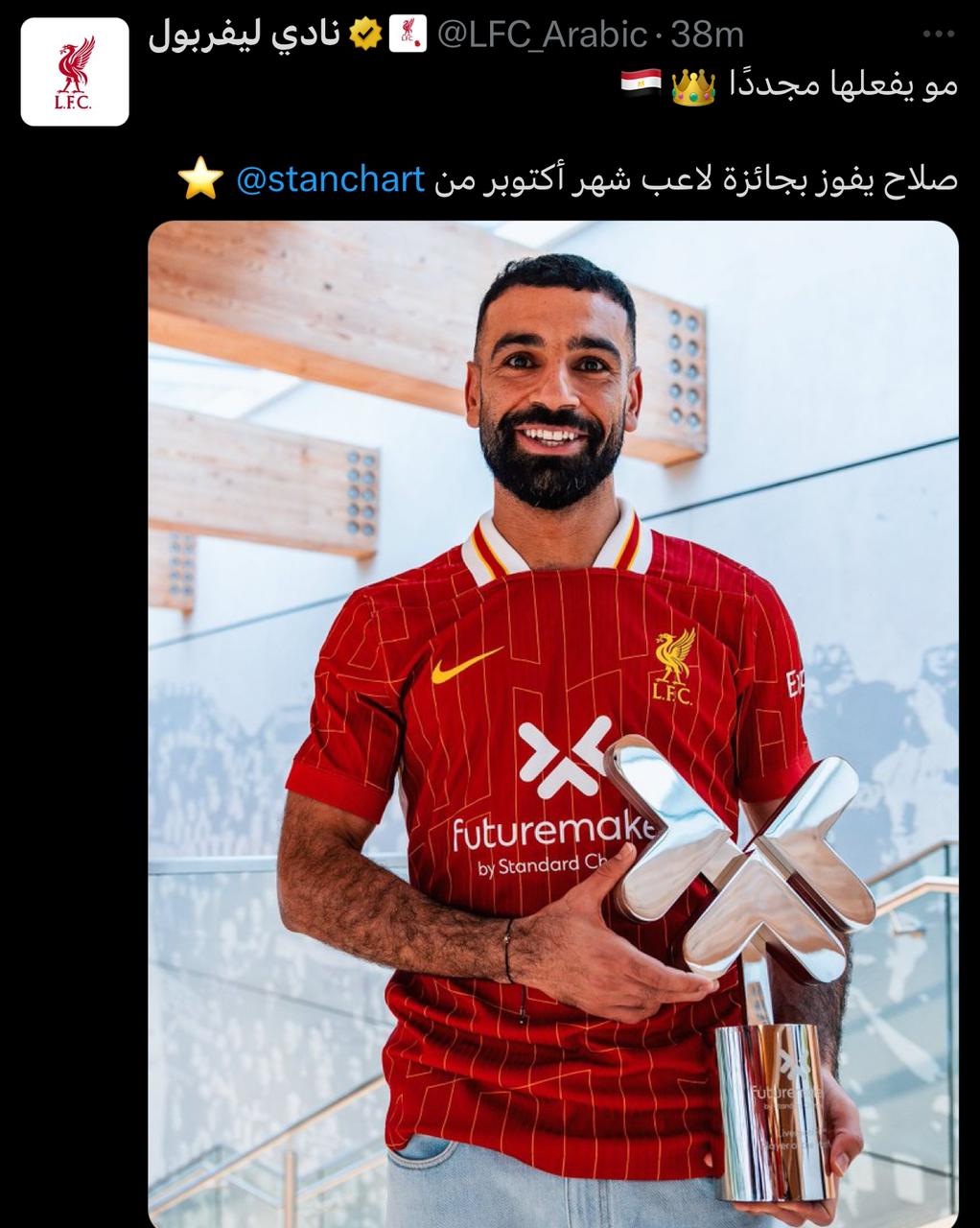 وأعلن الفريق الإنجليزي عن فوز صلاح بالجائزة عبر حسابه الرسمي علي موقع التواصل الاجتماعي “ اكس ” حيث قام بنشر صورة للفرعون المصري رفقة الجائزة وعلقت “ مو يفعلها مجددا، صلاح يفوز بجائزة أفضل لاعب لشهر أكتوبر ”.