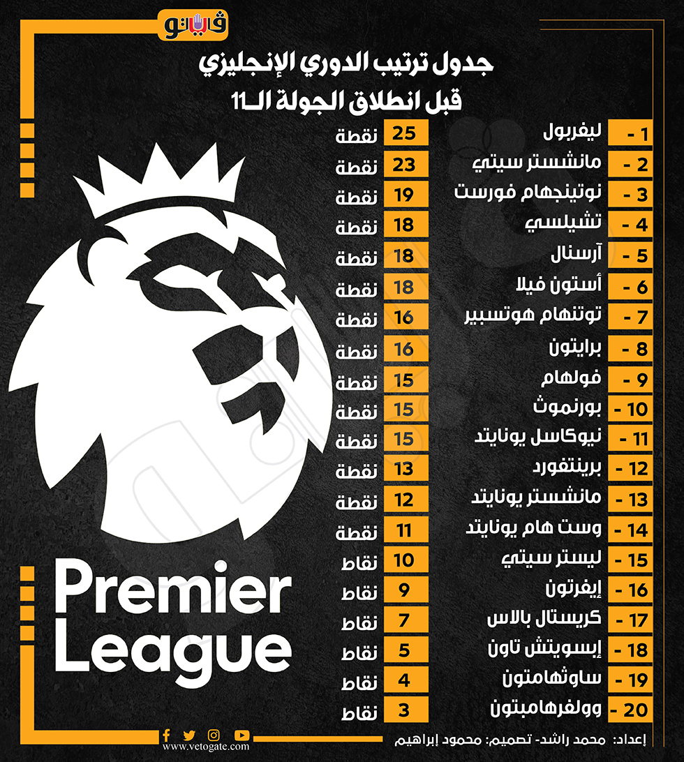 جدول ترتيب الدوري الإنجليزي قبل انطلاق الجولة الـ11 (إنفوجراف) السبت 09/نوفمبر/2024 - 01:13 م 11/9/2024 1:13:15 PM الدوري الإنجليزي، فيتو محمد راشد شارك طباعة 18 حجم الخط شارك طباعة الدوري الانجليزي ليفربول مانشستر سيتي تشيلسي أرسنال