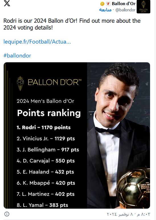 كما أزاحت "ليكيب" الستار عن تفاصيل فوز نجم مانشستر سيتي بالجائزة، بعد أن كشفت أن رودري توج بالكرة الذهبية بـ 1170 نقطة، بفارق 41 نقطة فقط عن فينيسيوس (1129).