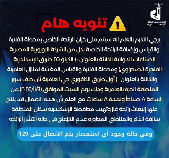 وأوضحت المحافظة أن ملء خزان الرائحة الخاص بمحطة الفلترة والقياس يبدأ اليوم السبت الموافق (٢٠٢٤/١١/٩) من الساعة ٨ صباحًا ولمدة ٨ ساعات مع العلم بأن هذه الأعمال قد ينتج عنها انبعاث رائحة غاز.