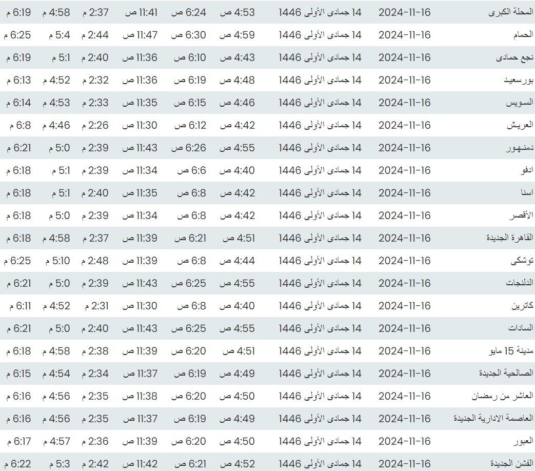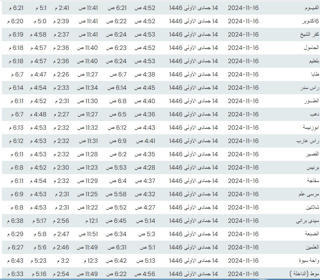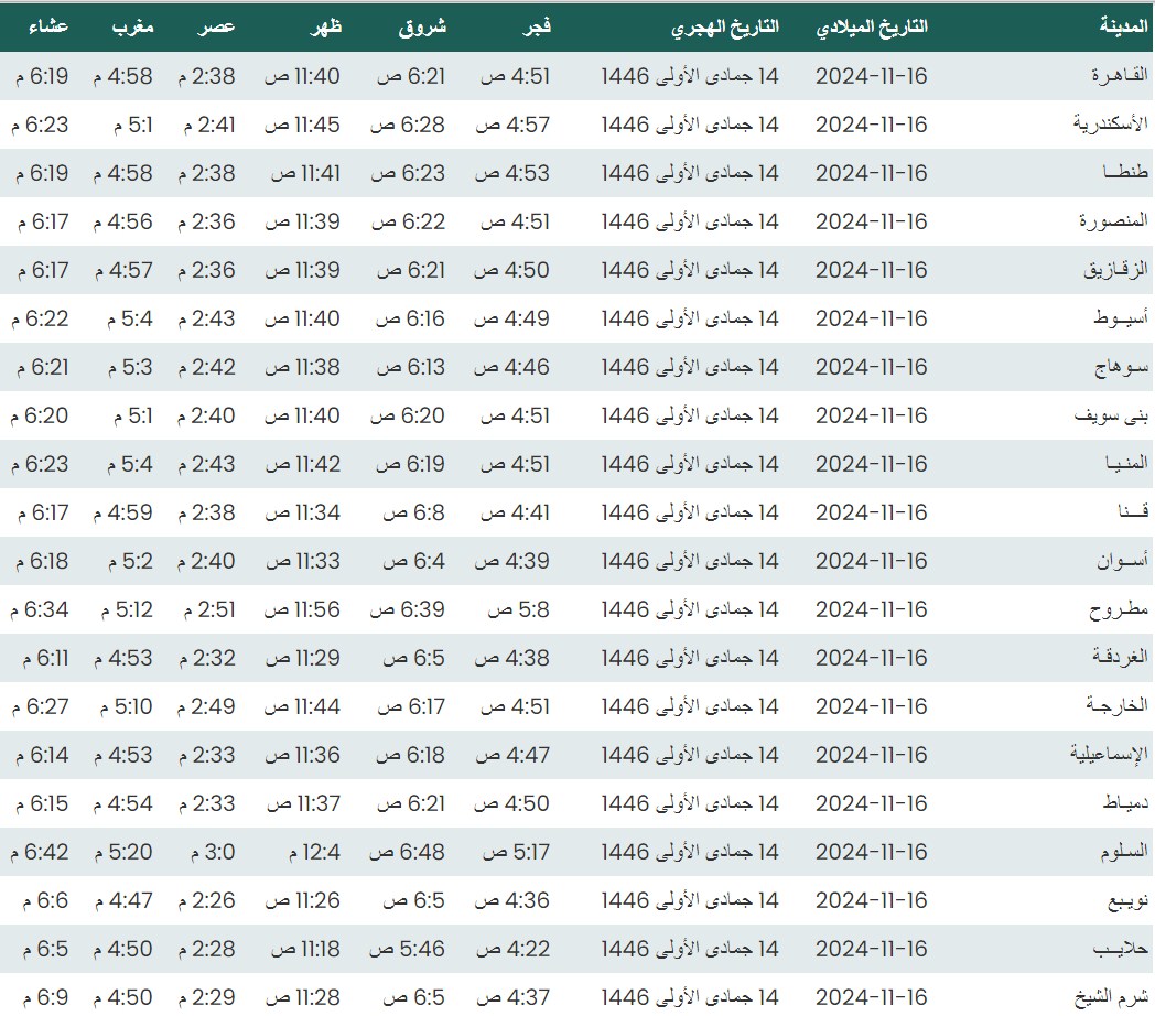 وفيما يلي مواقيت الصلاة، لعدد من مدن ومحافظات الجمهورية من واقع بيانات الهيئة العامة للمساحة