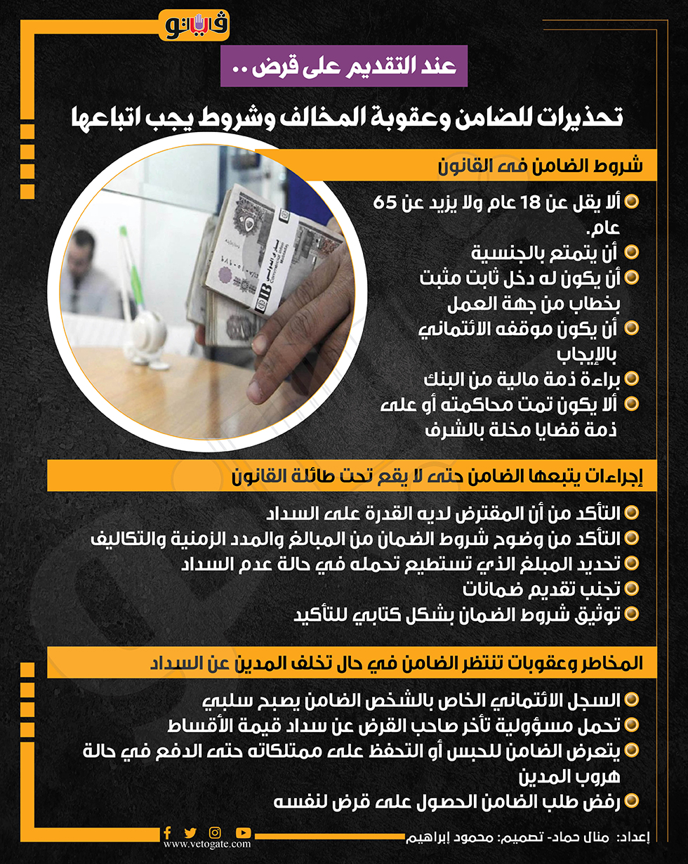عند التقديم على قرض.. تحذيرات للضامن وعقوبة المخالف وشروط يجب اتباعها (انفوجراف) الأحد 10/نوفمبر/2024 - 09:55 ص 11/10/2024 9:55:56 AM تحذيرات للضامن وعقوبة المخالف وشروط يبنبغي اتباعها،فيتو منال حماد شارك طباعة 18 حجم الخط شارك طباعة الضمان للضامن شروط الضامن فى القانون