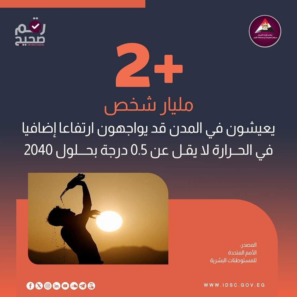 نشرت الصفحة الرسمية لمركز المعلومات ودعم اتخاذ القرار بمجلس الوزراء على موقع التواصل الاجتماعي فيسبوك، إنفوجراف جديدًا تحت عنوان (2 مليار شخص يعيشون في المدن قد يواجهون ارتفاعات إضافيًا في الحرارة لا يقل عن 0.5 درجة بحلول 2040).
