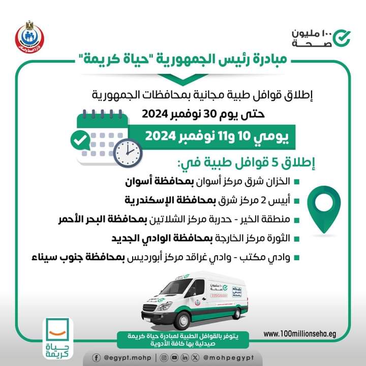 أعلنت وزارة الصحة إطلاق 5 قوافل طبية ضمن مبادرة رئيس الجمهورية حياة كريمة يومي ١٠ و١١ نوفمبر للكشف والعلاج مجانًا في التخصصات الطبية نساء وولادة - خدمات تنظيم الأسرة - الأطفال والباطنة - الأنف والأذن والعظام - الجراحة - الرمد الأسنان - القلب - الجلدية وخدمات الأشعة والتحاليل.
