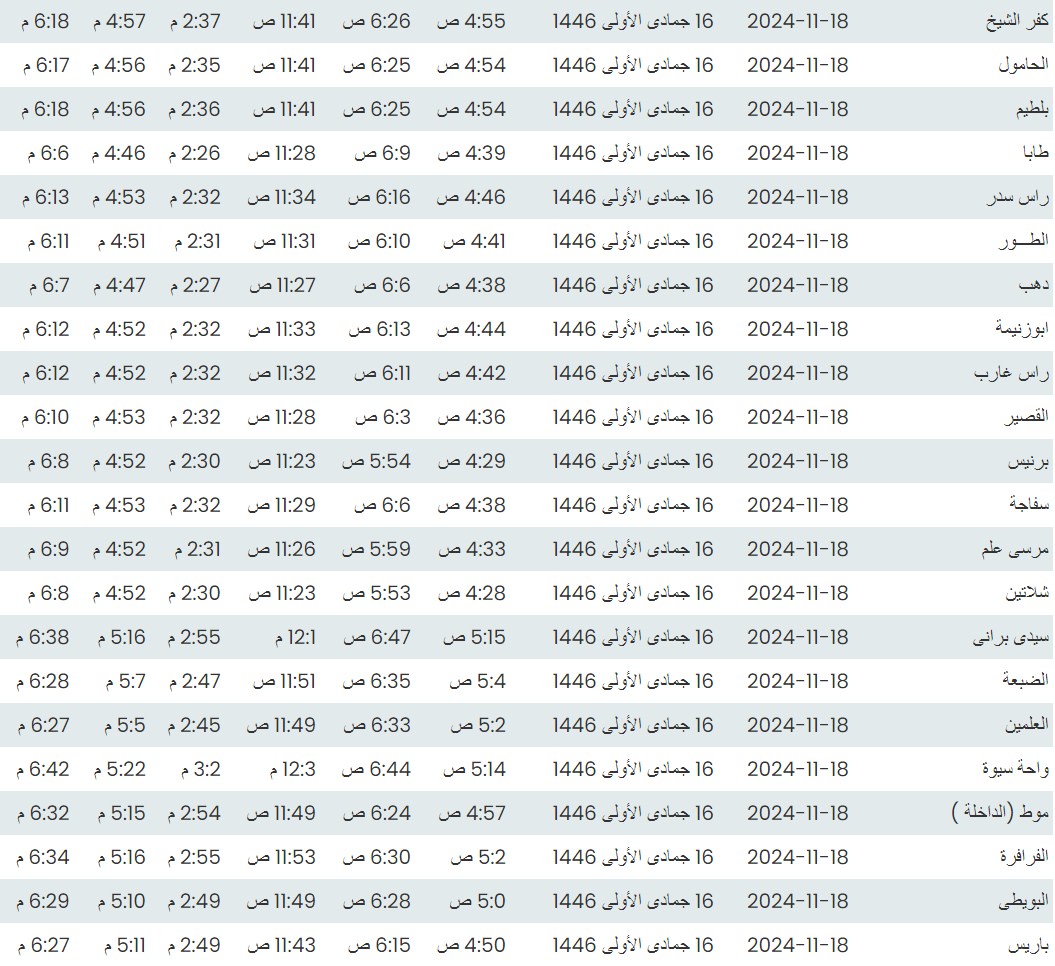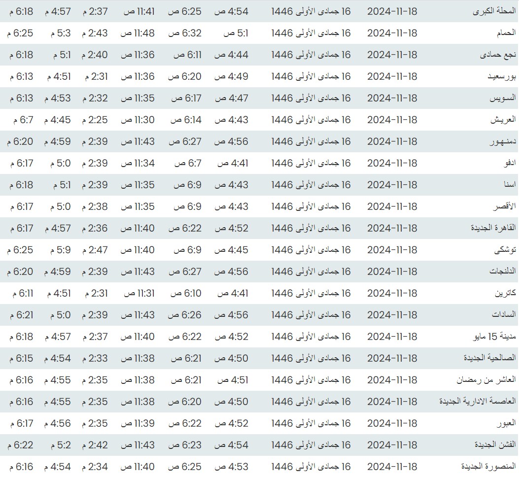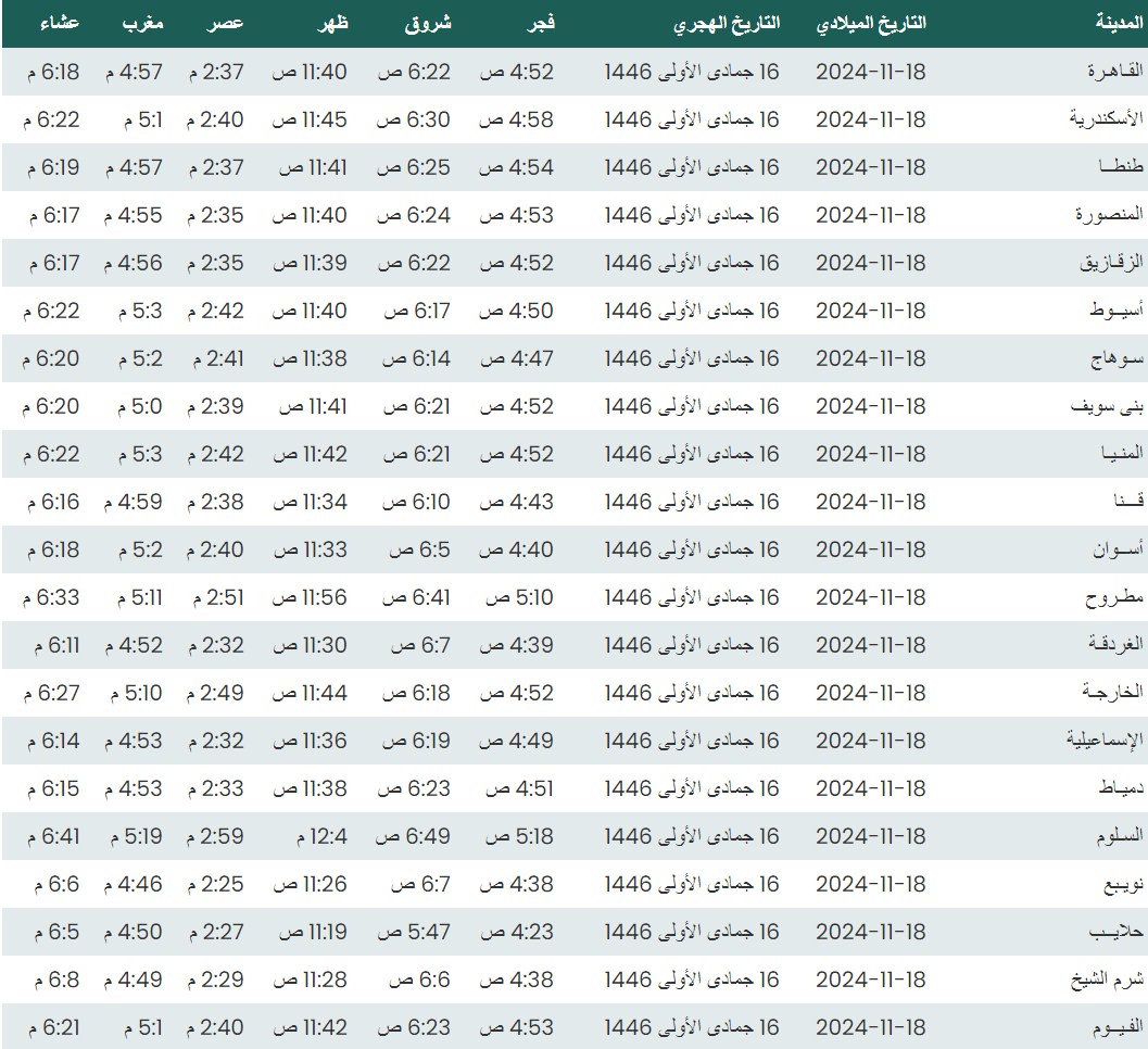 وفيما يلي مواقيت الصلاة، لعدد من مدن ومحافظات الجمهورية من واقع بيانات الهيئة العامة للمساحة