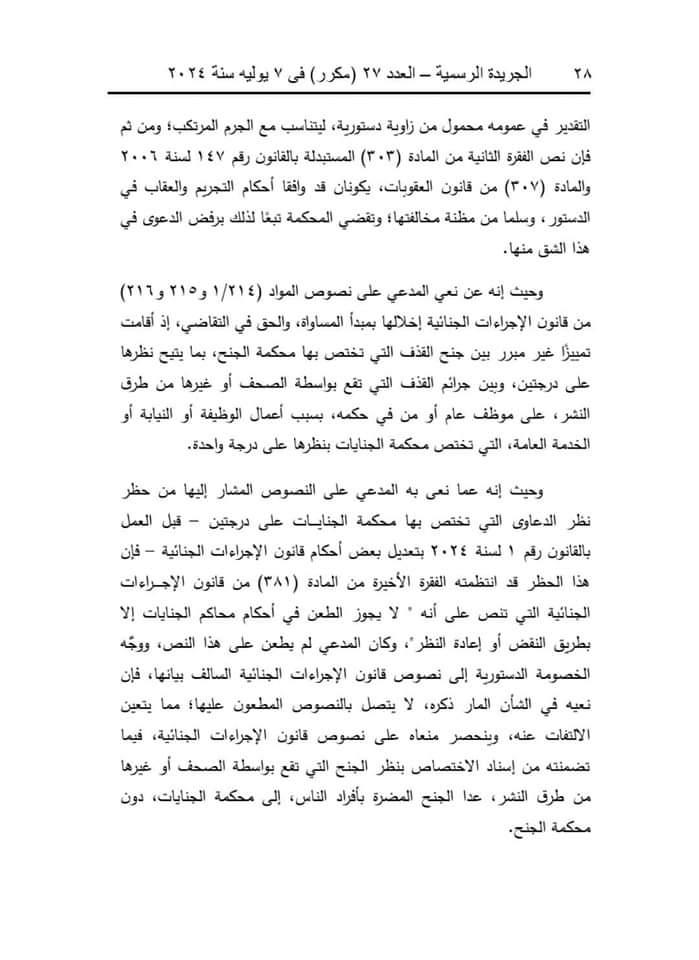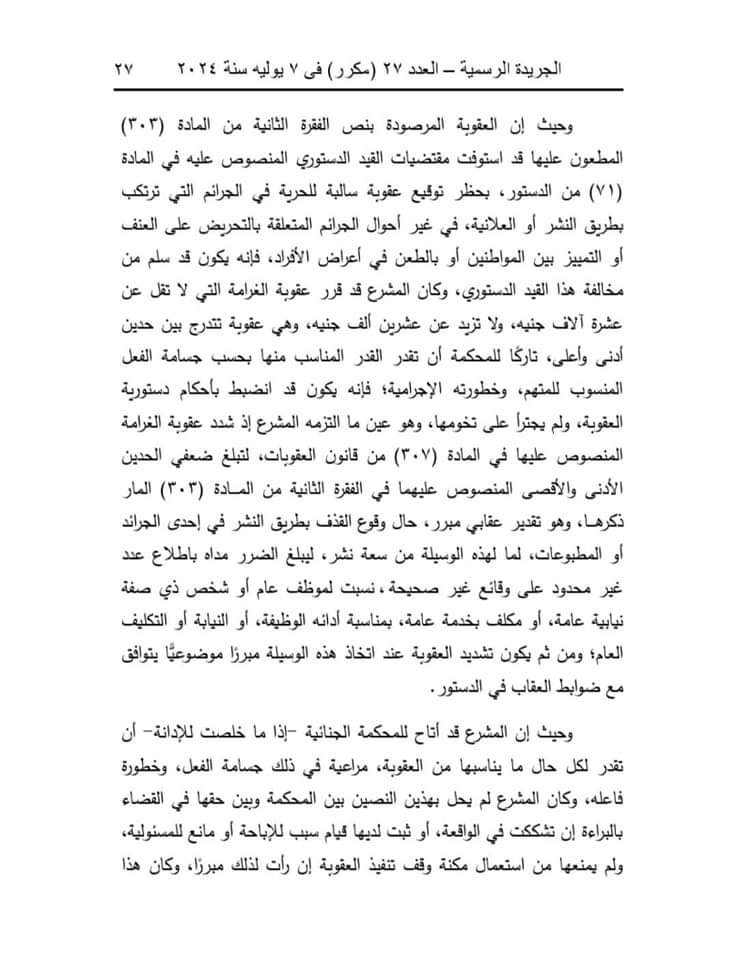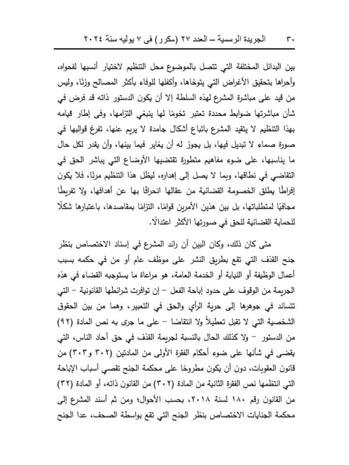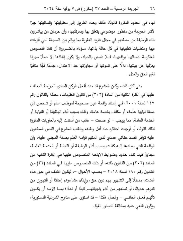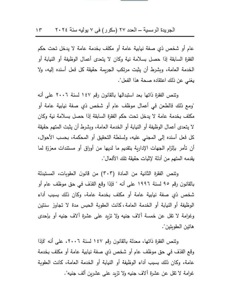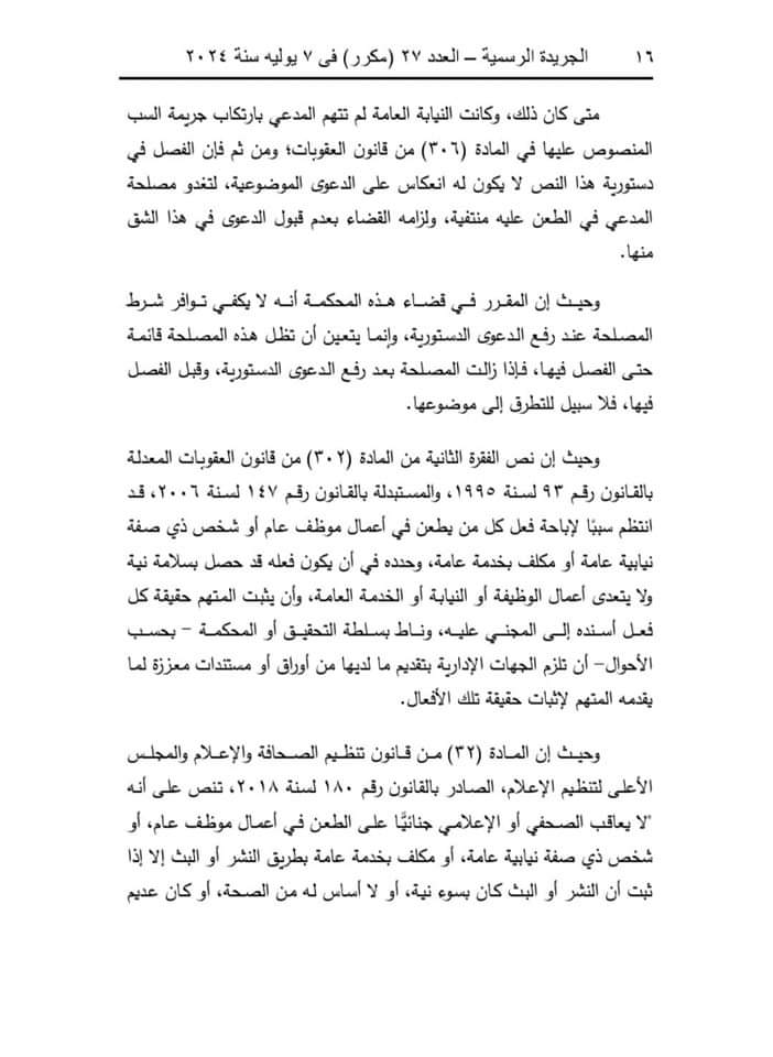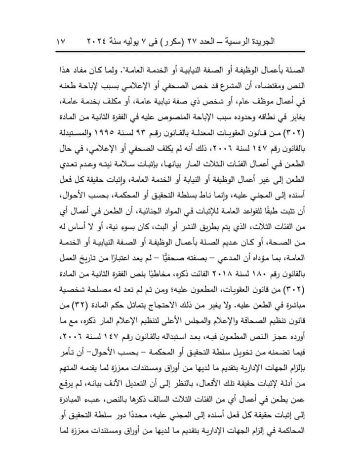 وقالت المحكمة إن المادة (32) من قانون تنظيم الصحافة والإعلام والمجلس الأعلى لتنظيم الإعلام، الصادر بالقانون رقم 180 لسنة 2018، تنص على أنه لا يعاقب الصحفي أو الإعلامي جنائيًّا على الطعن في أعمال موظف عام، أو شخص ذي صفة نيابية عامة، أو مكلف بخدمة عامة بطريق النشر أو البث إلا إذا ثبت أن النشر أو البث كان بسوء نية، أو لا أساس له من الصحة، أو كان عديم الصلة بأعمال الوظيفة أو الصفة النيابية أو الخدمة العامة.