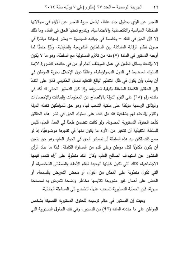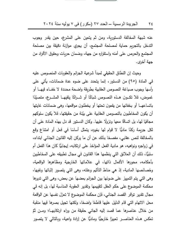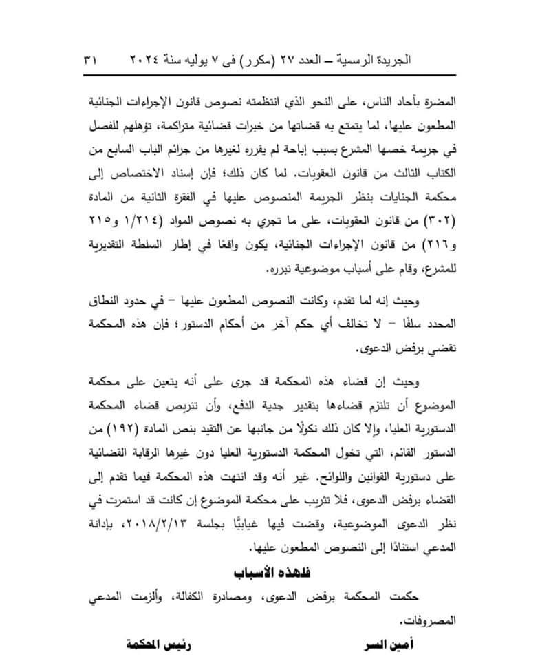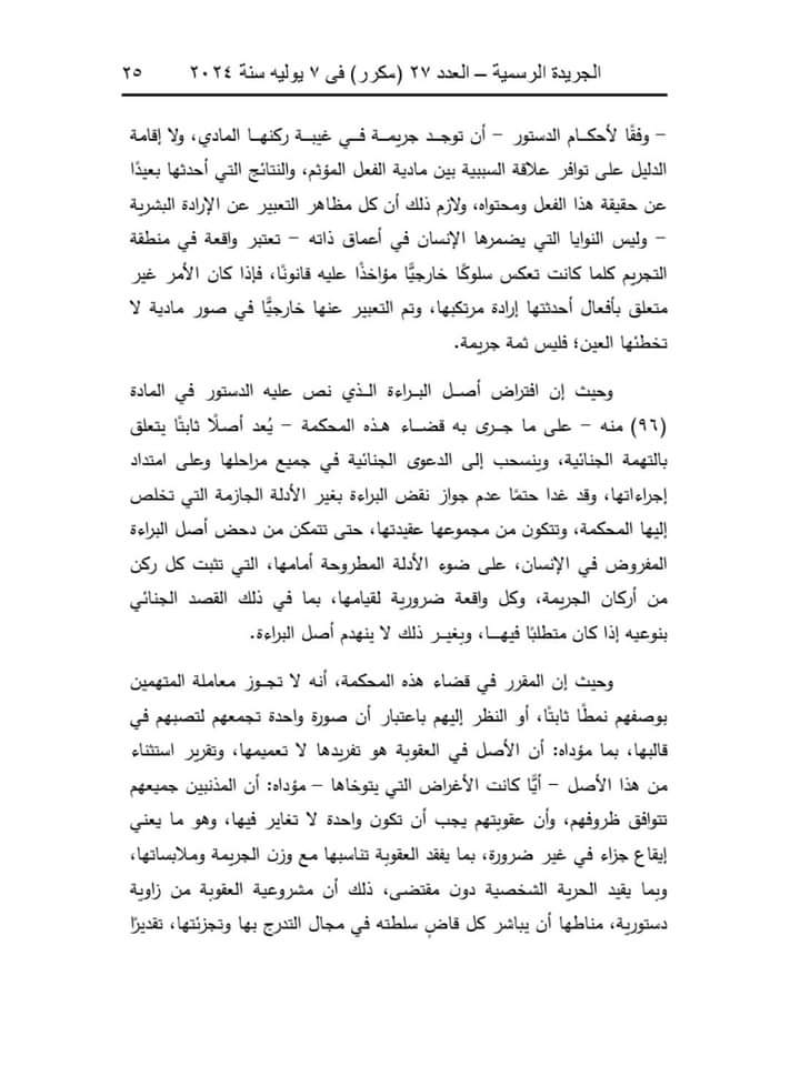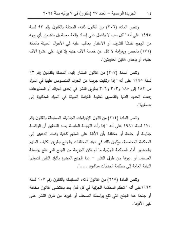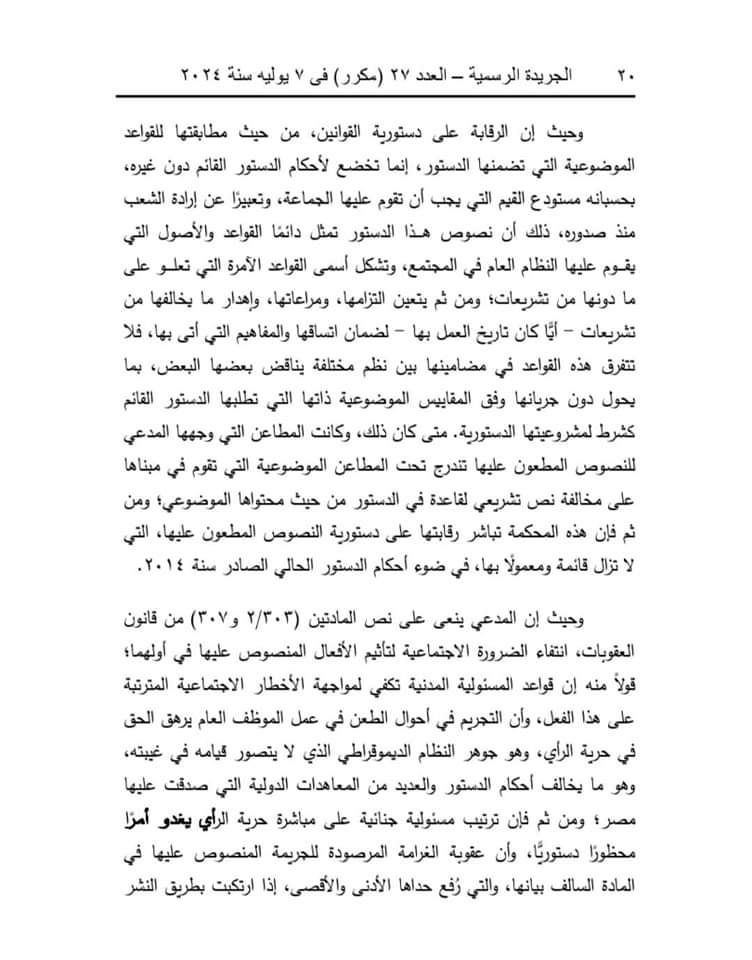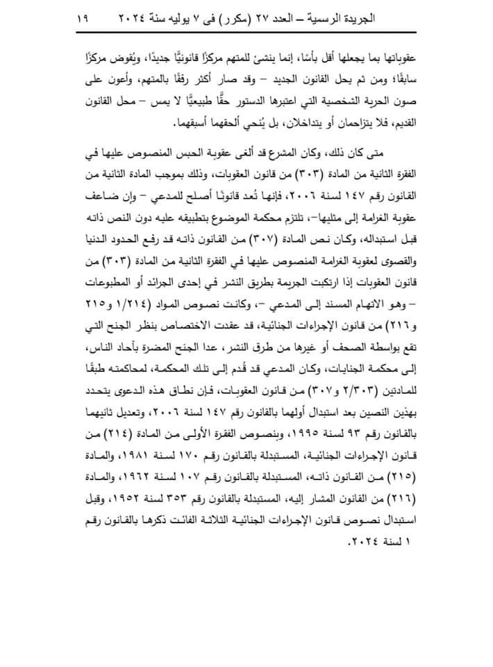 وقالت المحكمة إن المادة (32) من قانون تنظيم الصحافة والإعلام والمجلس الأعلى لتنظيم الإعلام، الصادر بالقانون رقم 180 لسنة 2018، تنص على أنه لا يعاقب الصحفي أو الإعلامي جنائيًّا على الطعن في أعمال موظف عام، أو شخص ذي صفة نيابية عامة، أو مكلف بخدمة عامة بطريق النشر أو البث إلا إذا ثبت أن النشر أو البث كان بسوء نية، أو لا أساس له من الصحة، أو كان عديم الصلة بأعمال الوظيفة أو الصفة النيابية أو الخدمة العامة.