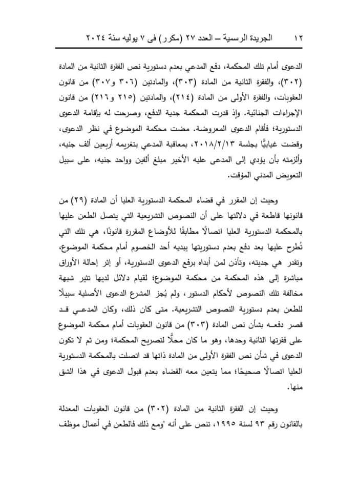 النص الكامل لحيثيات حكم الدستورية بحظر الحبس في جريمة قذف الموظف العام عن طريق النشر (مستندات)