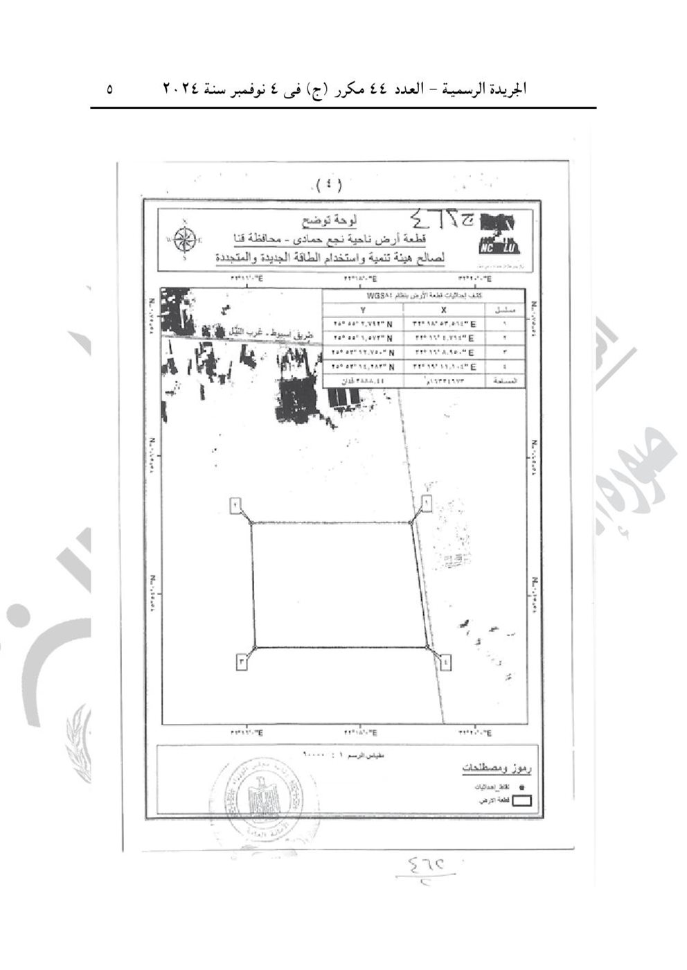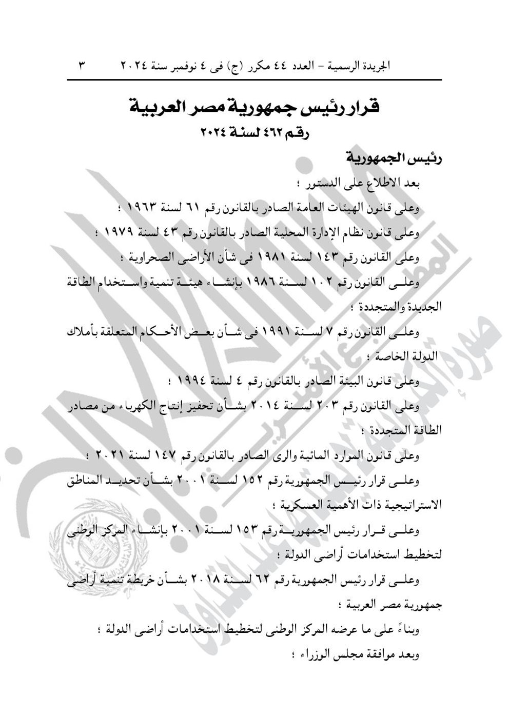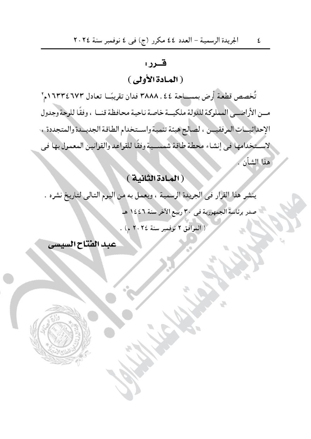 -القرار الجمهوري الجديد رقم 462 لسنة 2024، بشأن تخصيص قطعة أرض بمساحة 3888٫44 فدان تقريبًا من الأراضى المملوكة للدولة ملكية خاصة، ناحية محافظة قنا، وفقًا للوحة وجدول الإحداثيات، لصالح هيئة تنمية واستخدام الطاقة الجديدة والمتجددة، لاستخدامها فى إنشاء محطة طاقة شمسية، وفقًا للقواعد والقوانين المعمول بها فى هذا الشأن.