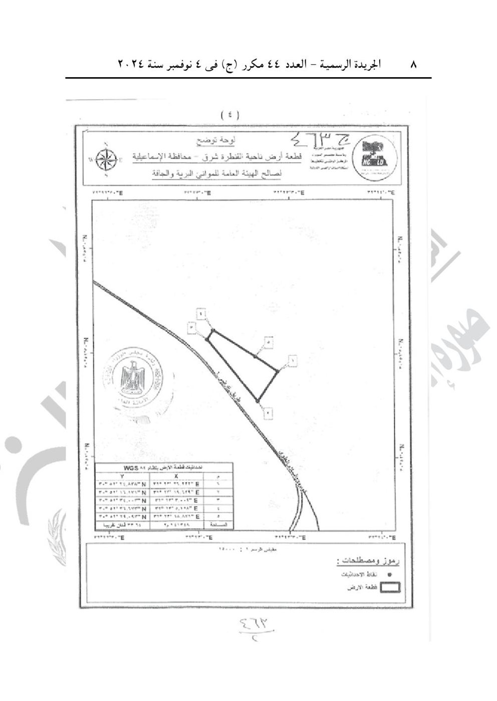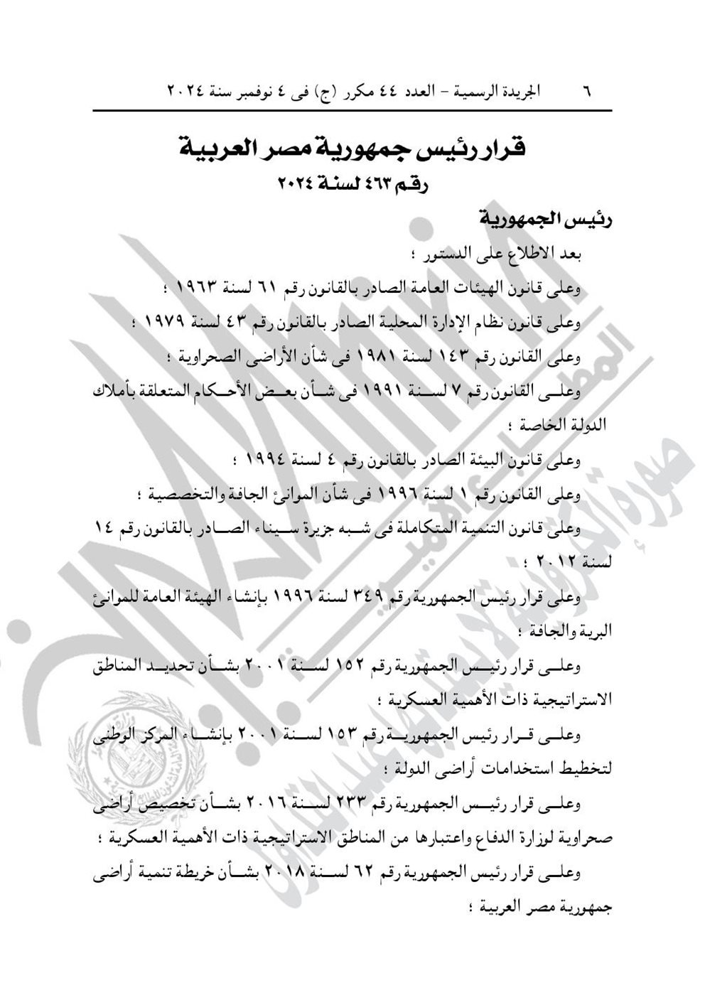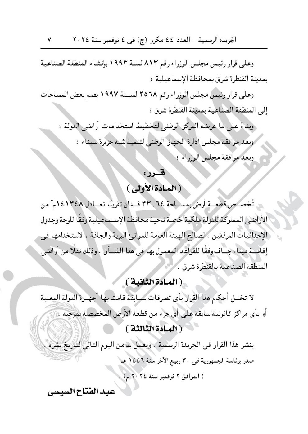 -القرار الجمهوري رقم 463 لسنة 2024، بشأن تخصيص قطعة أرض بمساحة 33٫64 فدان تقريبًا من الأراضى المملوكة للدولة ملكية خاصة ناحية محافظة الإسماعيلية، وفقا للوحة وجدول الإحداثيات المرفقين، لصالح الهيئة العامة للموانئ البرية والجافة، لاستخدامها فى إقامة ميناء جاف، وفقًا للقواعد المعمول بها فى هذا الشأن، وذلك نقلًا من أراضى المنطقة الصناعية بالقنطرة شرق.