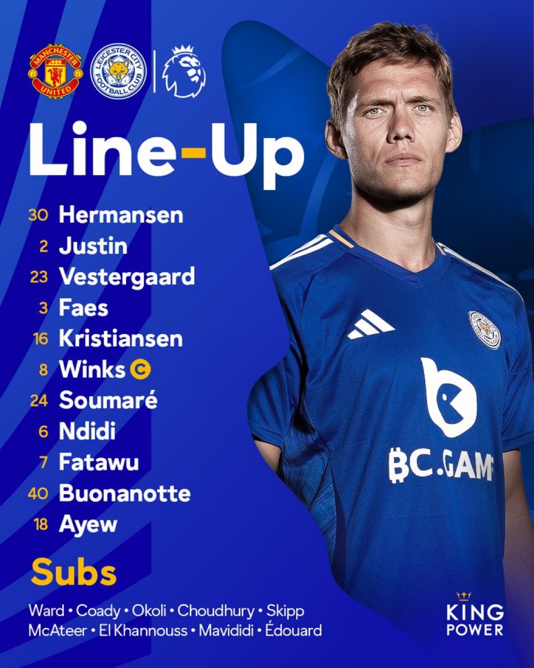 وجاء تشكيل ليستر سيتي كالتالي: هيرمانسن، جاستن، فيسترجارد، فايس، كريستيانسن، وينكس، سوماري، نديدي، فاتاوو، بونانوتي، أيو.
