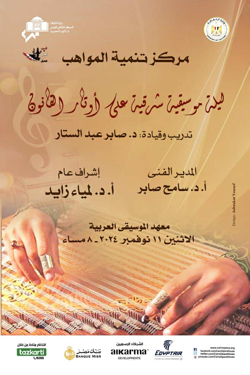 تنظم دار الأوبرا المصرية برئاسة الدكتورة لمياء زايد حفلا لمركز تنمية المواهب تحت إشراف مديره الفنى الدكتور سامح صابر بعنوان "ليلة موسيقية شرقية على أوتار القانون" يحييه الواعدين بفصل القانون تدريب وقيادة دكتور صابر عبد الستار وذلك في الثامنة مساء الإثنين ١١ نوفمبر على مسرح معهد الموسيقي العربية.
