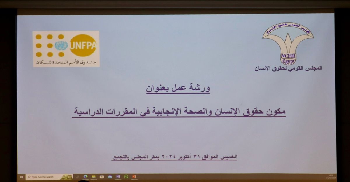 نظم المجلس القومي لحقوق الإنسان "لجنة الحقوق الاجتماعية بالتعاون مع اللجنة الثقافية "وصندوق الأمم المتحدة للسكان ورشة عمل تحت عنوان "مكون حقوق الإنسان والصحة الإنجابية في المقررات الدراسية ".