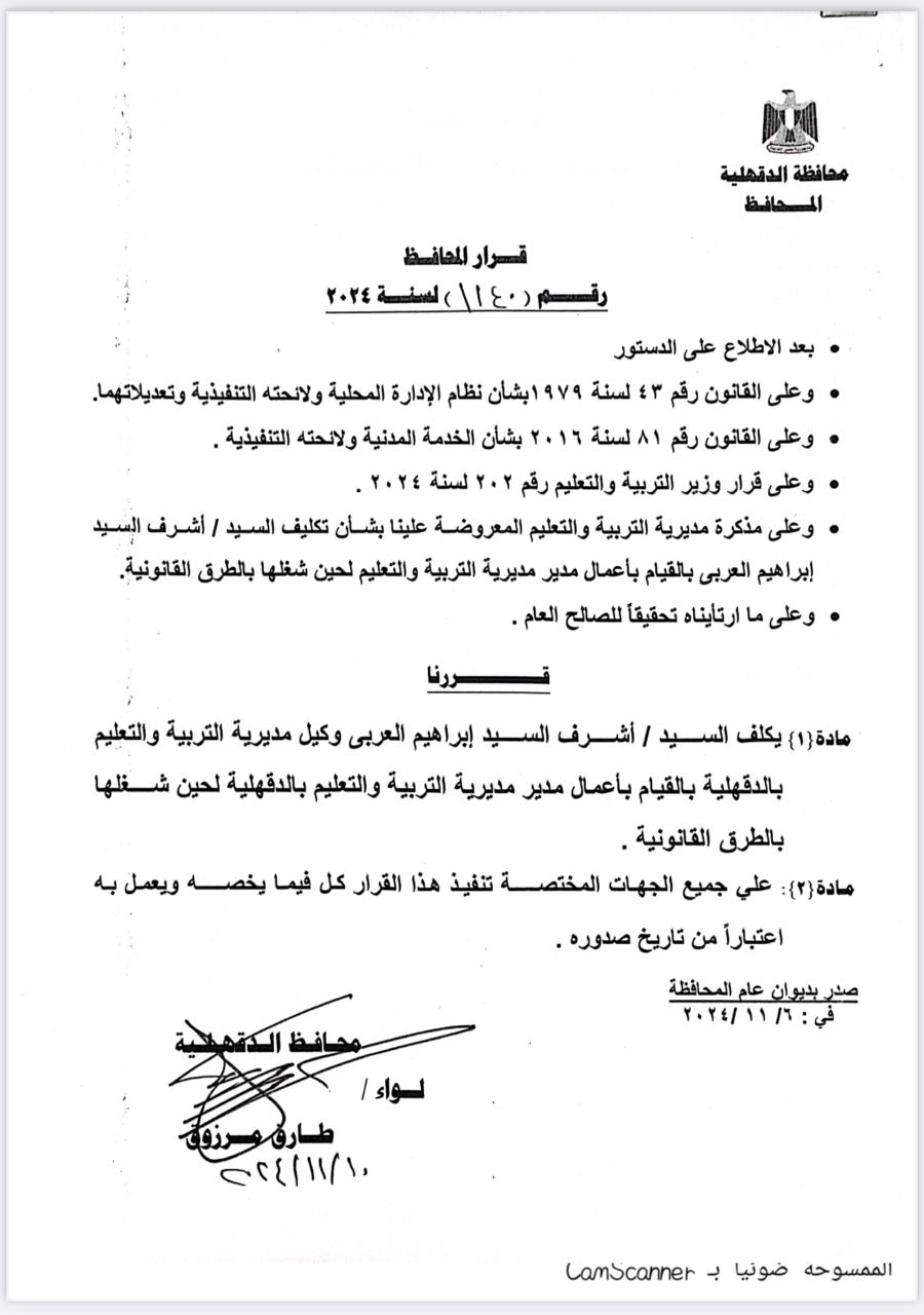 أصدر اللواء طارق مرزوق محافظ الدقهلية القرار رقم ( ١١٤٠ ) لسنة ٢٠٢٤ بشأن تكليف الدكتور أشرف السيد إبراهيم العربي مديرًا لمديرية التربية والتعليم.