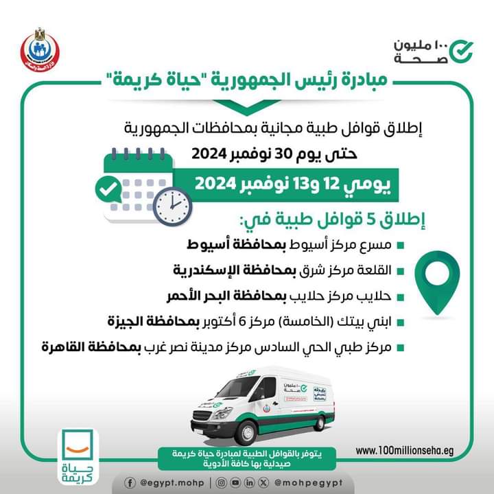 أعلنت وزارة الصحة إطلاق ٥ قوافل طبية ضمن مبادرة رئيس الجمهورية حياة كريمة يومي ١٢ و١٣ نوفمبر للكشف والعلاج مجانًا في التخصصات الطبية نساء وولادة - خدمات تنظيم الأسرة - الأطفال والباطنة - الأنف والأذن والعظام - الجراحة - الرمد الأسنان - القلب - الجلدية وخدمات الأشعة والتحاليل