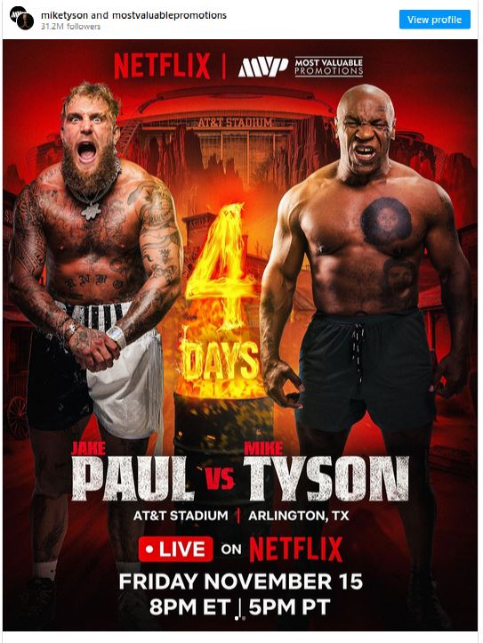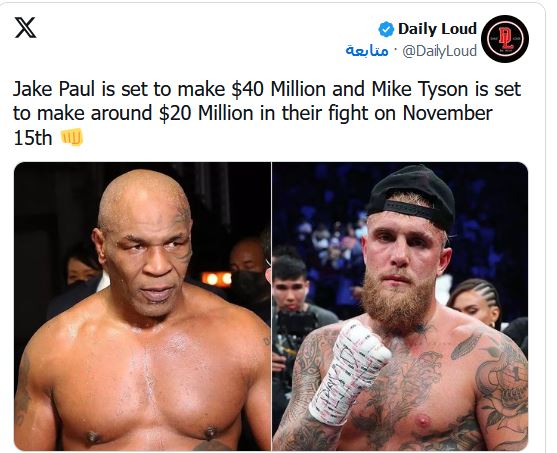ويحصل تايسون لقاء مواجهة بول البالغ 27 عامًا صانع محتوى على موقع "يوتيوب" تحول للملاكمة، وخاض 9 نزالات فاز في 8 منها وخسر واحدًا، على 20 مليون دولار، وفقا لمنشور موقع DailyLoud على منصة "X".