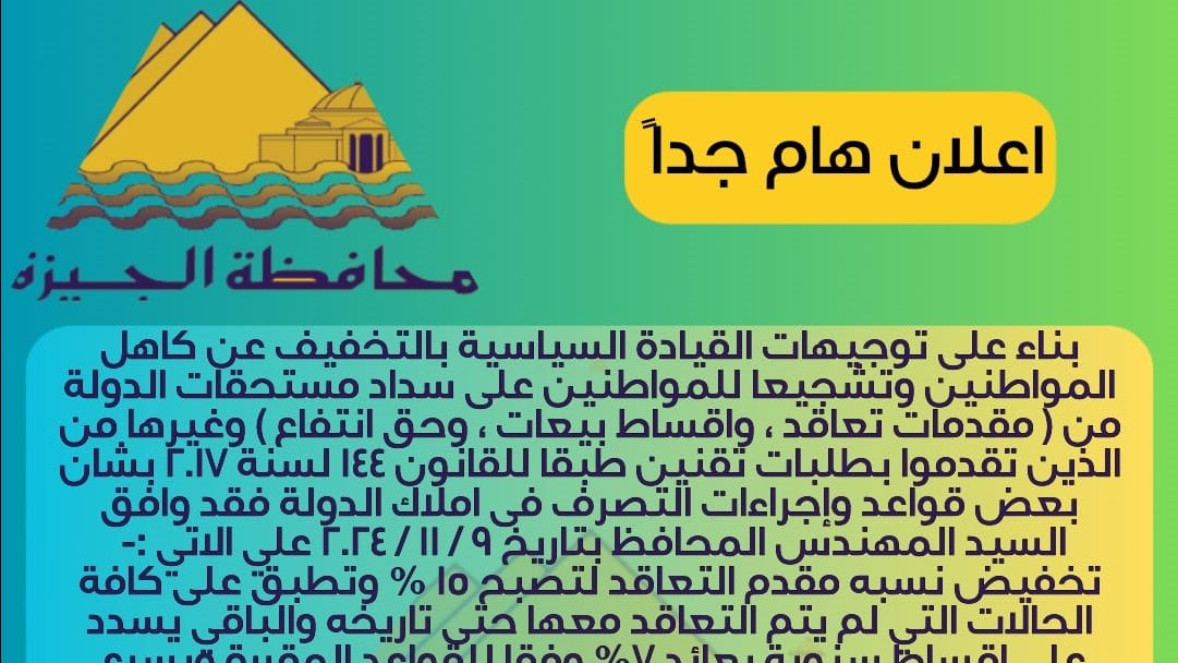 أعلن المهندس عادل النجار محافظ الجيزة، عن قرار هام بتخفيض نسبة مقدمات التعاقد على أراضي الدولة وإعفاء المتأخرين عن سداد أقساطهم من الغرامات.