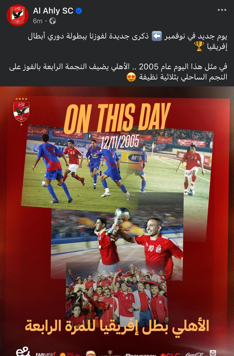 ونشر النادي الأهلي عبر حسابه الرسمي علي فيسبوك صوره ترصد فوز الأحمر باللقب الإفريقي الرابع في تاريخه وكتبت " يوم جديد في نوفمبر، ذكرى جديدة لفوزنا ببطولة دوري أبطال إفريقيا، في مثل هذا اليوم عام 2005، الأهلي يضيف النجمة الرابعة بالفوز على النجم الساحلي بثلاثية نظيفة.