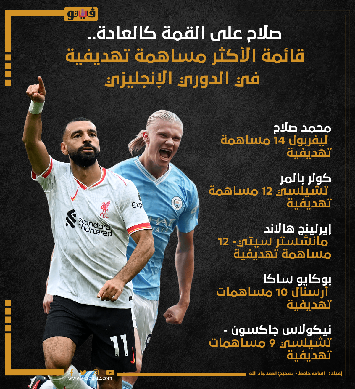 صلاح على القمة كالعادة.. قائمة الأكثر مساهمة تهديفية في الدوري الإنجليزي (إنفوجراف) الأربعاء 13/نوفمبر/2024 - 09:56 م 11/13/2024 9:56:19 PM محمد صلاح، فيتو اسامة حافظ شارك طباعة 18 حجم الخط شارك طباعة الدوري الإنجليزي ا الدوري الانجليزي صلاح انفوجراف