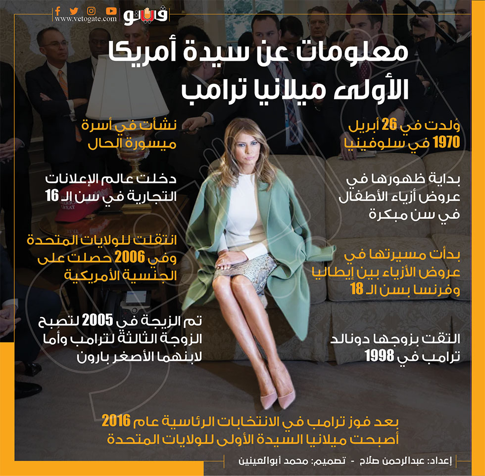 معلومات عن سيدة أمريكا الأولى ميلانيا ترامب (إنفوجراف) الجمعة 15/نوفمبر/2024 - 01:31 م 11/15/2024 1:31:34 PM ترامب وميلانيا، فيتو عبدالرحمن صلاح شارك طباعة 18 حجم الخط شارك طباعة ميلانيا ترامب سلوفينيا عروض ازياء الأطفال دونالد ترامب ترامب وميلانيا الولايات المتحدة