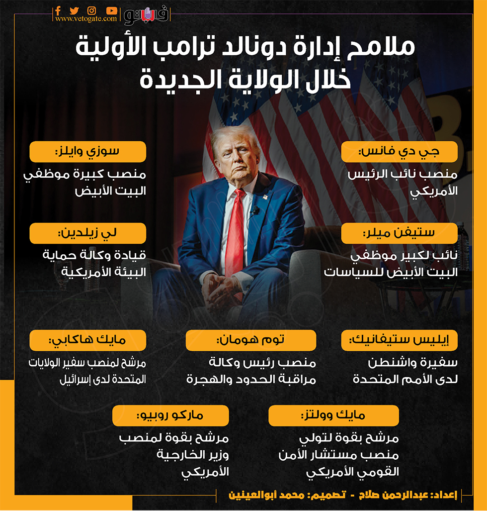 ملامح إدارة دونالد ترامب الأولية خلال الولاية الجديدة (إنفوجراف) الجمعة 15/نوفمبر/2024 - 06:30 م 11/15/2024 6:30:39 PM ترامب، فيتو عبدالرحمن صلاح شارك طباعة 18 حجم الخط شارك طباعة جي دي فانس الرئيس الأمريكى البيت الأبيض توم هومان ماركو روبيو وزير الخارجية الأمريكي ترامب إدارة ترامب الجديدة