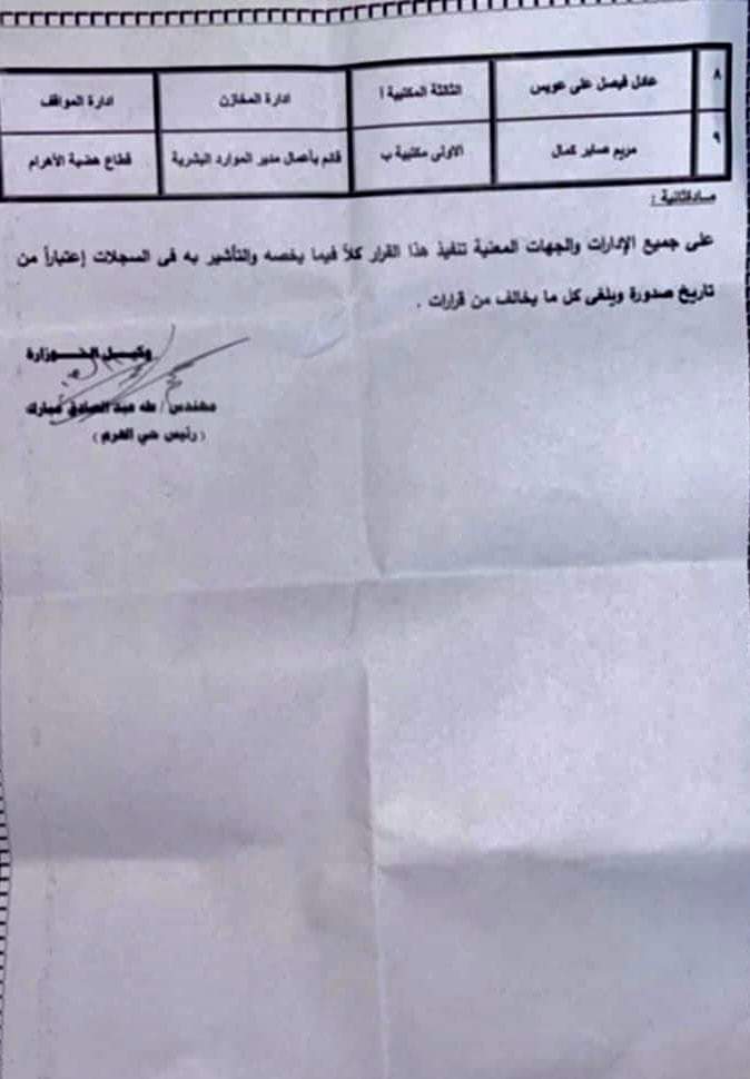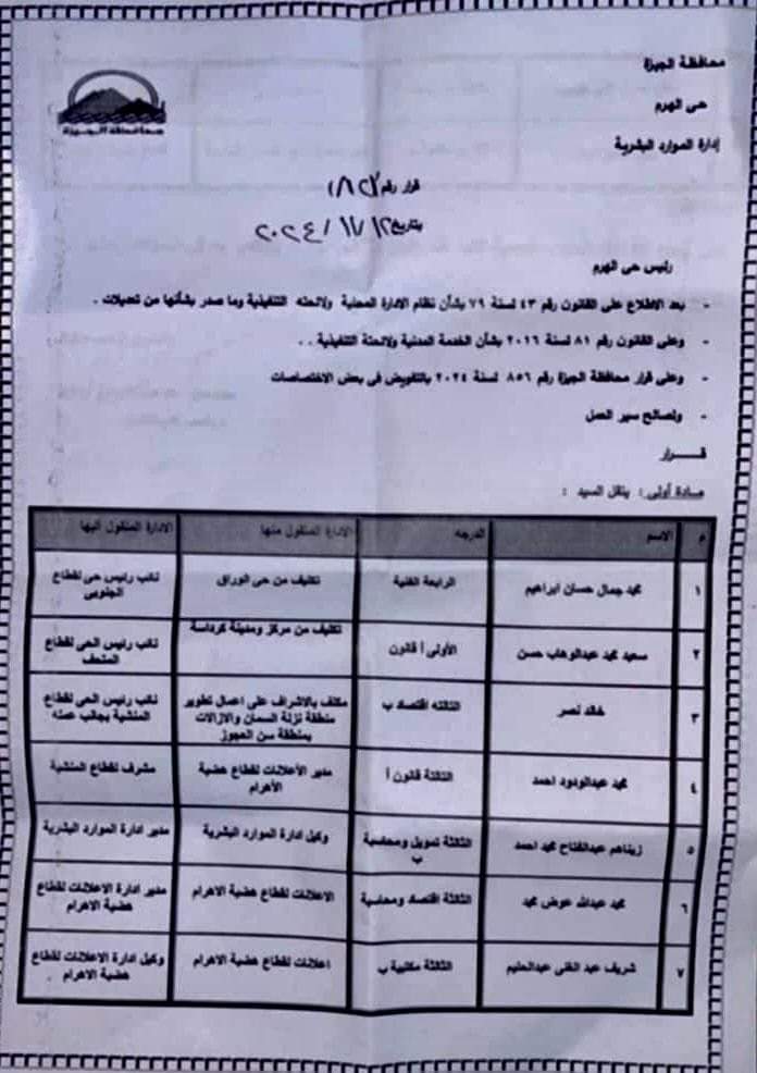 رئيس حي الهرم يجري حركة تغييرات موسعة بمختلف القطاعات (مستند)