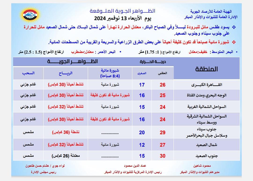 كشفت هيئة الأرصاد الجوية حالة الطقس اليوم الأربعاء 13 - 11 -2024، محذرة من نشاط للرياح على معظم الأنحاء وشبورة مائية صباحية ببعض المناطق.