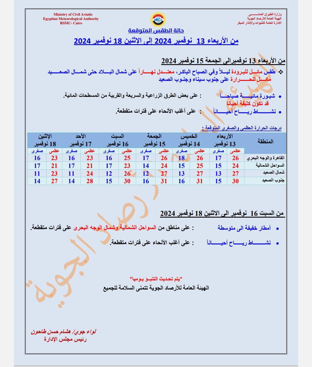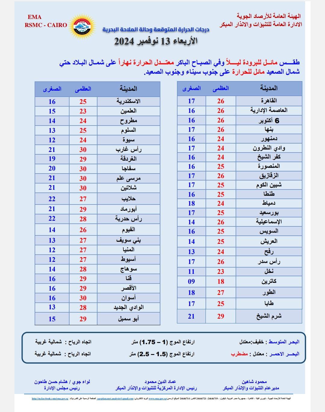 ونشرت هيئة الأرصاد بيانًا بدرجات الحرارة المتوقعة اليوم الأربعاء على مدن ومحافظات مصر، وجاءت كالتالي: