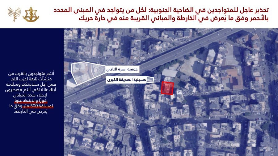 وجاء في البيانات التحذيرية: "إلى جميع السكان المتواجدين في منطقة الضاحية الجنوبية وتحديدًا في المبنى المحدد في الخريطة المرفقة والمباني المجاورة له في منطقة حارة حريك، الليلكي والغبيري، أنتم تتواجدون بالقرب من منشآت ومصالح تابعة لحزب الله حيث سيعمل ضدها جيش الدفاع بقوة على المدى الزمني القريب من أجل سلامتكم".