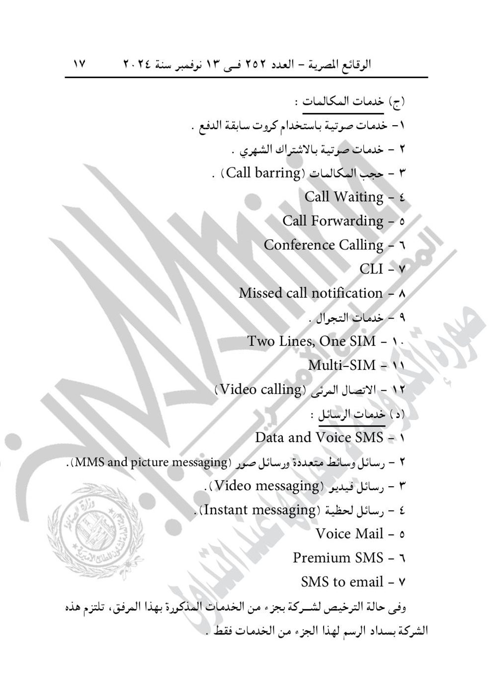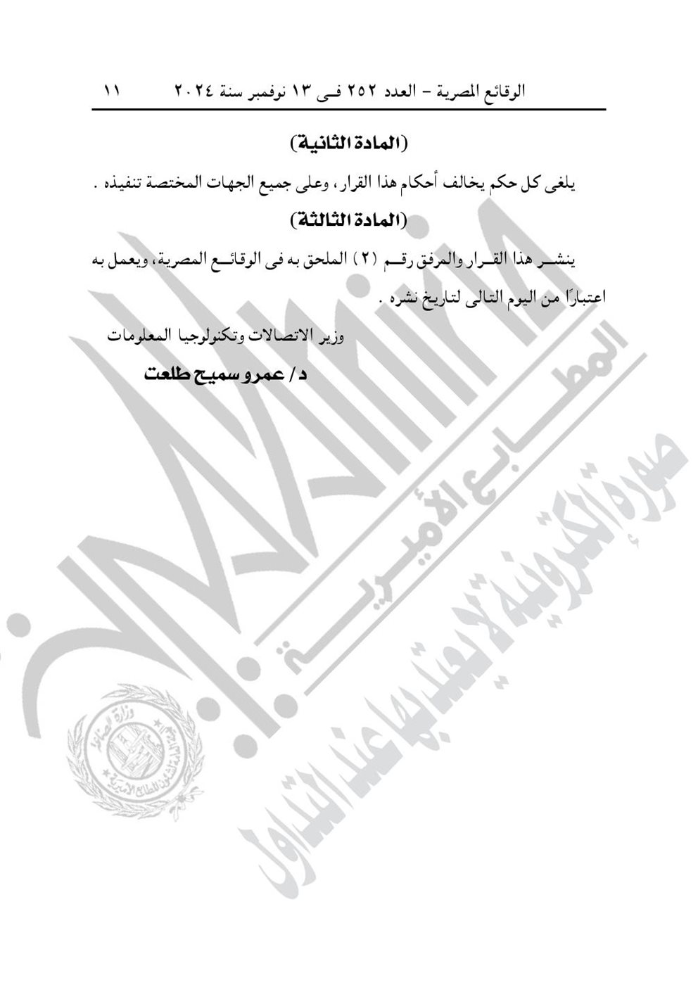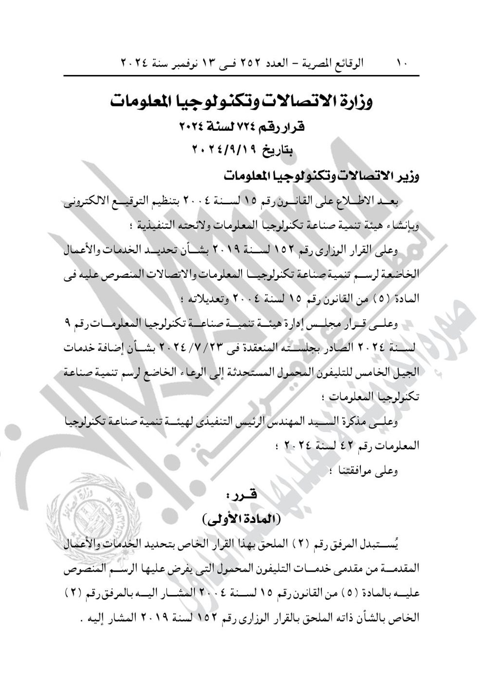 نشرت جريدة الوقائع المصرية في عددها رقم 252، الصادر في 13 نوفمبر 2024، قرار وزارة الاتصالات وتكنولوجيا المعلومات رقم 724 لسنة 2024، بشأن تحديد الخدمات والأعمال الخاضعة لرسم تنمية صناعة تكنولوجيا المعلومات والاتصالات.