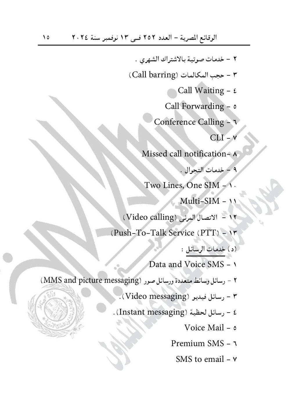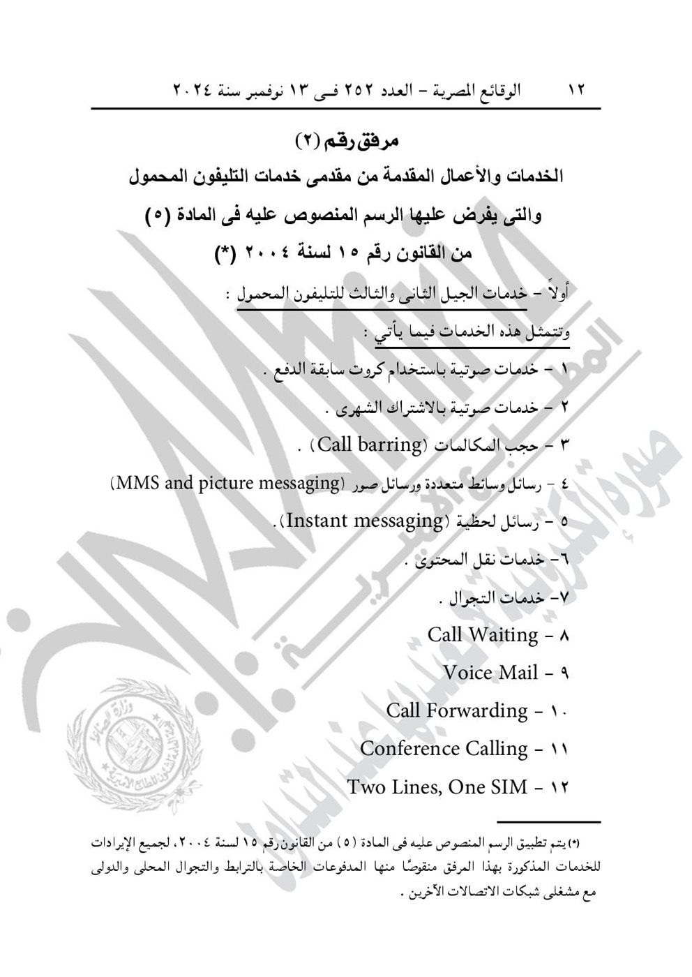 وجاء في المادة الأولى لـ قرار وزارة الاتصالات وتكنولوجيا المعلومات “يستبدل المرفق رقم (2) الملحق بهذا القرار الخاص بتحديد الخدمات والأعمال المقدمة من مقدمى خدمات التليفون المحمول التى يفرض عليها الرسم المنصوص عليه بالمادة (5) من القانون رقم 15 لسنة 2004، الخاص بالشأن ذاته الملحق بالقرار الوزارى رقم ١٥٢ لسنة ٢٠١٩”.
