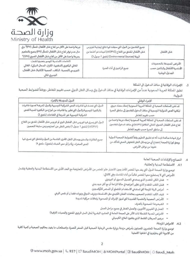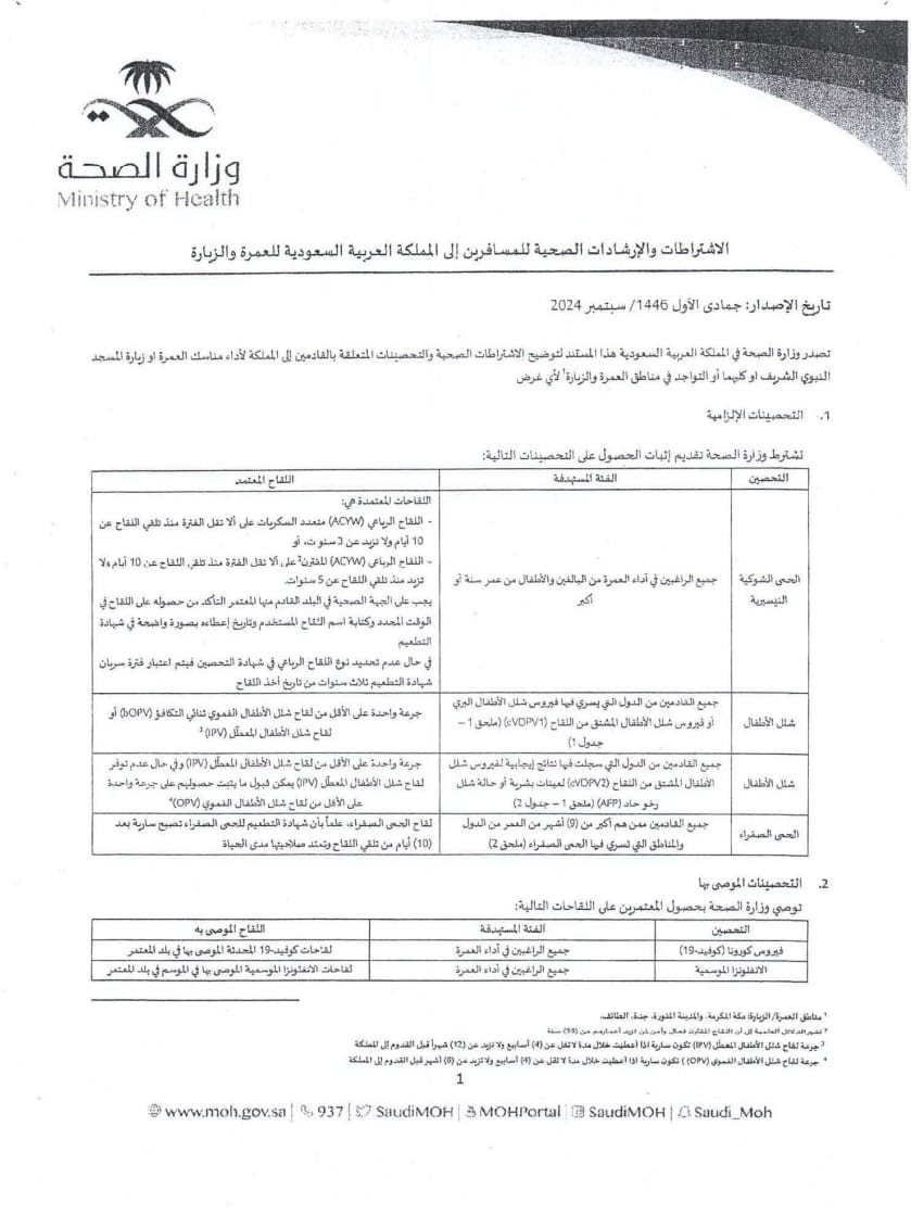 وأوضحت الغرفة في خطابها إلى شركات السياحة: «في إطار التنسيق بين وزارة السياحة والآثار وغرفة شركات ووكالات السفر والسياحة الموسم عمرة 1446 هـ، فإن الغرفة تلقت كتاب من وزارة السياحة والآثار المتضمن كتاب مساعد وزير الخارجية والهجرة والمصريين بالخارج للشئون القنصلية والمصريين بالخارج والذي يفيد بتلقى القطاع القنصلى مذكرة سفارة المملكة العربية السعودية بالقاهرة والمرفق بها الاشتراطات الصحية الموضحة من وزارة الصحة السعودية بالنسبة للمسافرين إلى المملكة العربية السعودية لأداء مناسك العمرة».