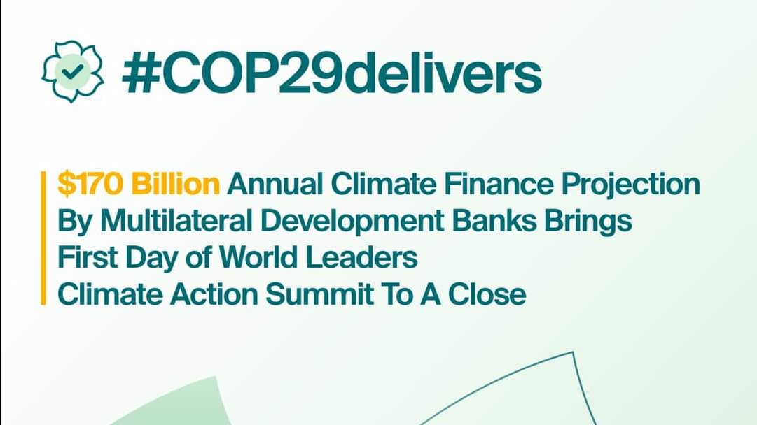 أعلنت بنوك التنمية المتعددة الأطراف خلال مؤتمر الأطراف COP29 في باكو عن تعهدها بتقديم تمويل سنوي يصل إلى 170 مليار دولار أمريكي لمشاريع المناخ حتى عام 2030.