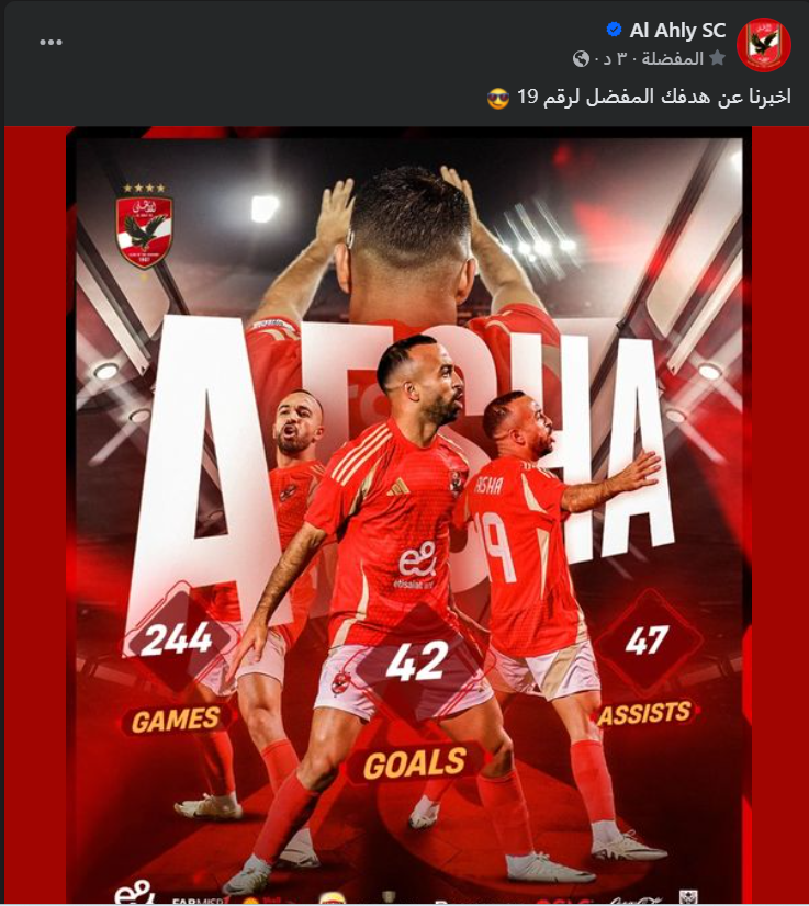 ونشرت الصفحة الرسمية للنادي الأهلي علي فيسبوك صورة لـ أفشة وعلقت عليها:" اخبرنا عن هدفك المفضل لرقم 19 ".