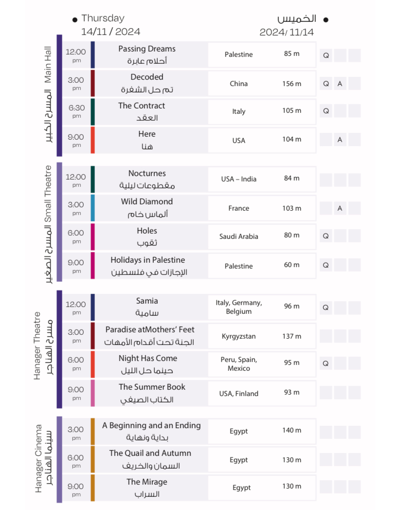 ينظم مهرجان القاهرة السينمائي الدولي في دورته الـ 45 برئاسة الفنان الكبير حسين فهمي، اليوم الخميس، العديد من الفعاليات والندوات والجلسات الحوارية، بالإضافة إلى عروض الأفلام بمسابقات المهرجان المختلفة، ويأتي برنامج اليوم كالتالي: