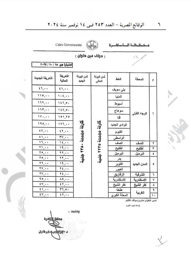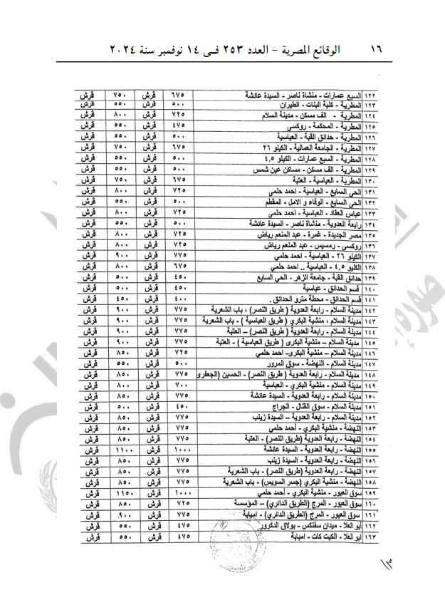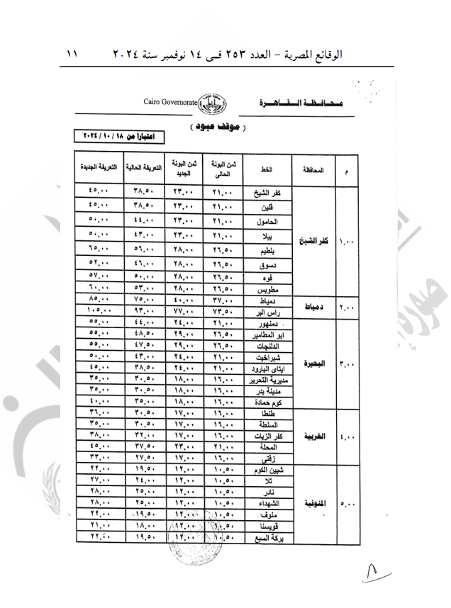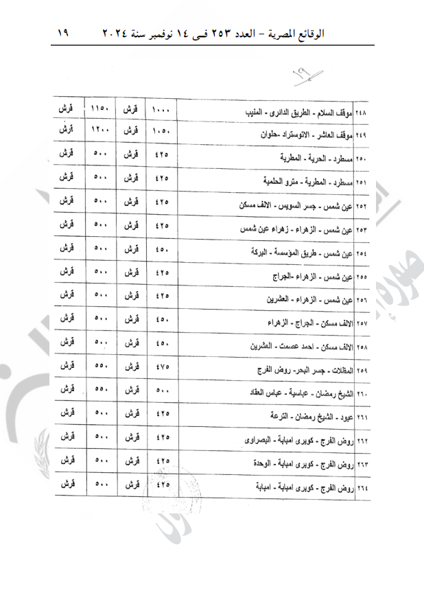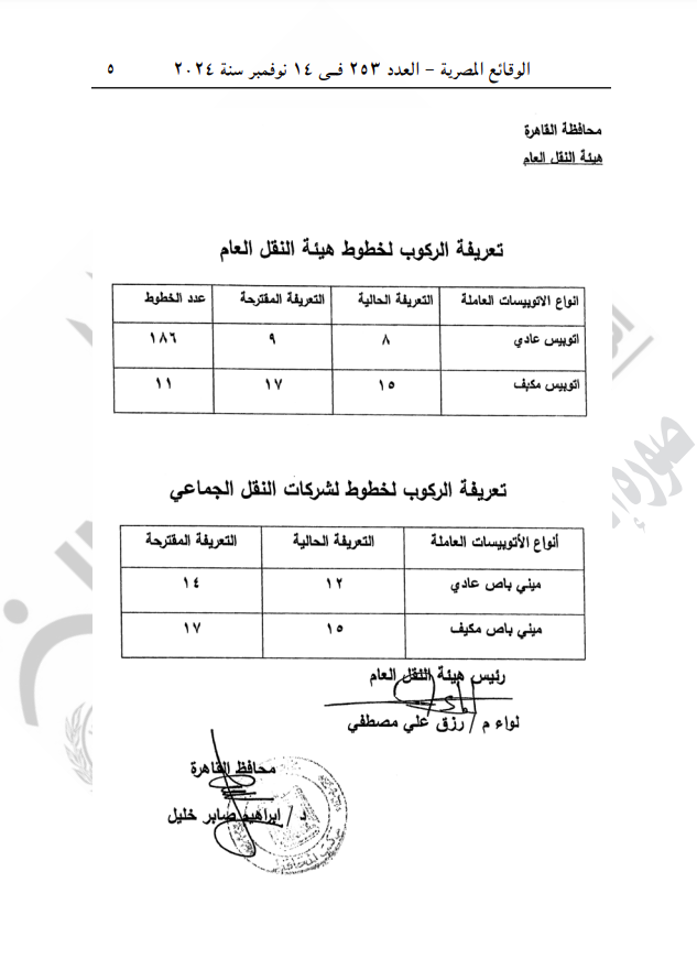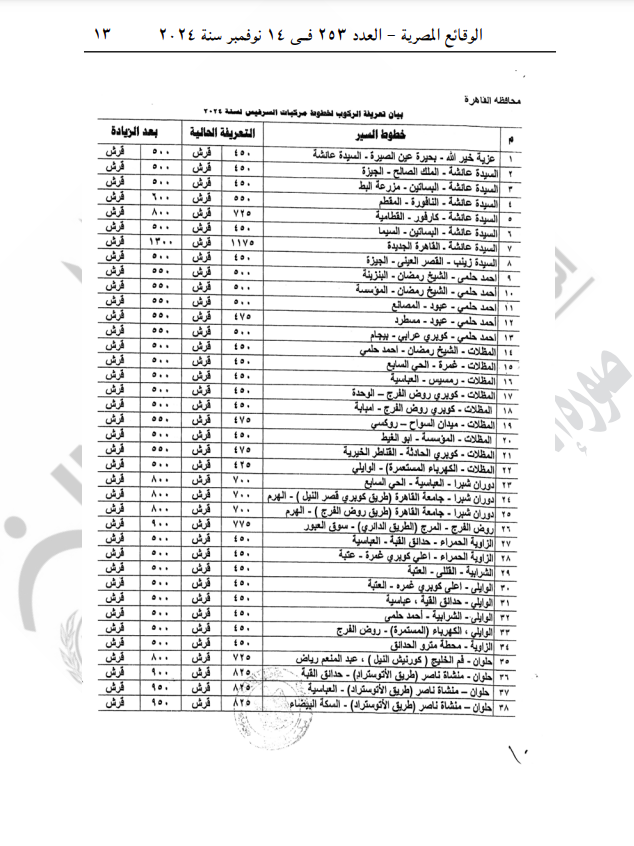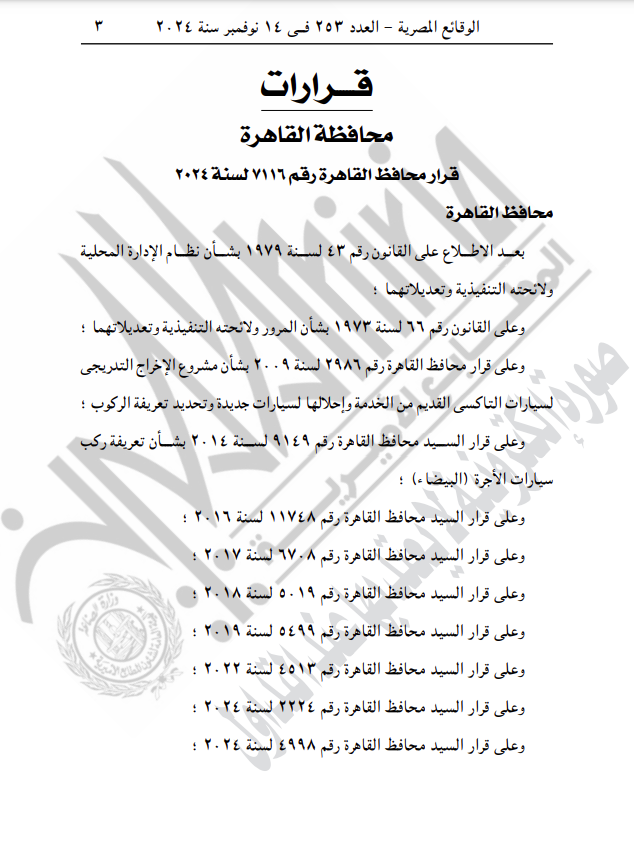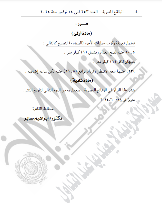 نشرت جريدة الوقائع المصرية في عددها رقم253، الصادر في 14 نوفمبر 2024، قرار محافظة القاهرة رقم 7116 لسنة 2024، بشأن تعديل تعريفة ركوب سيارات الأجرة البيضاء.
