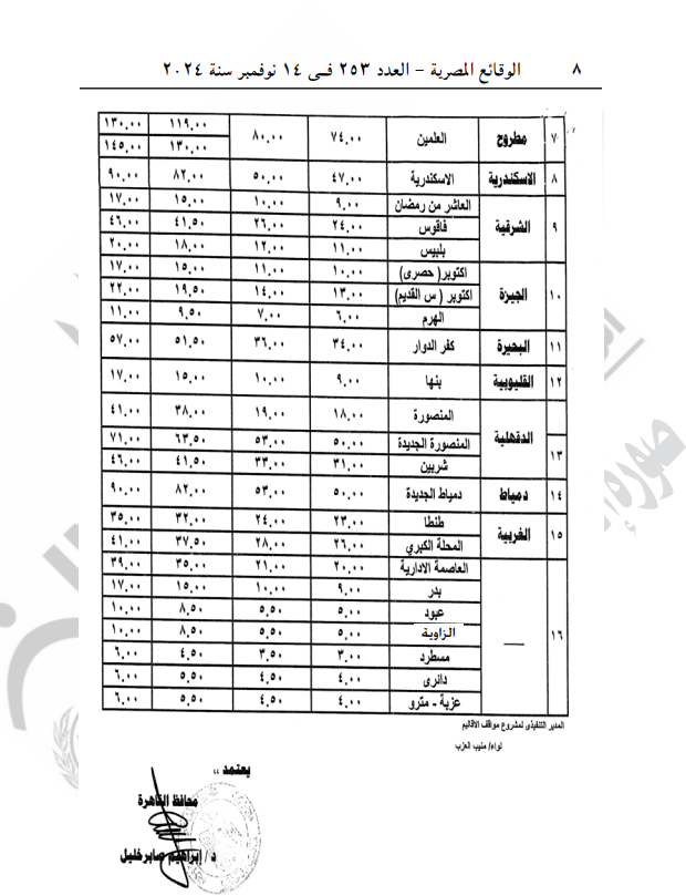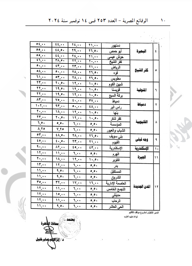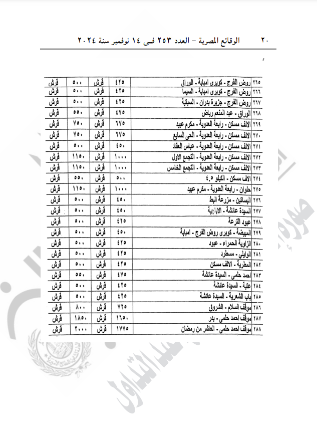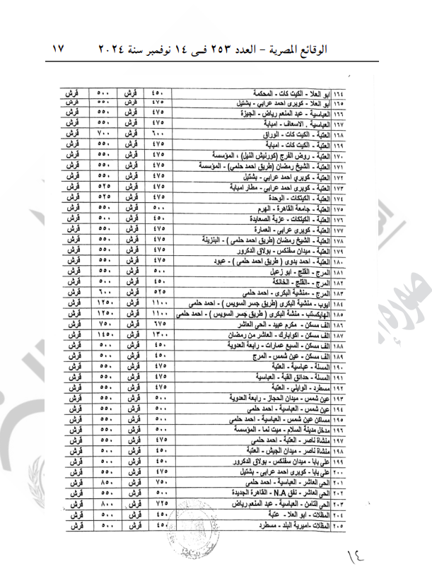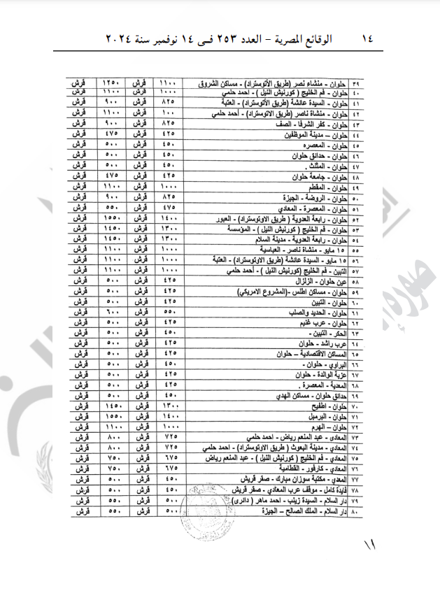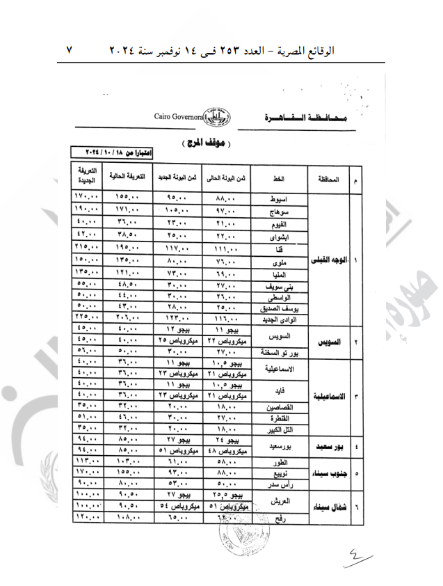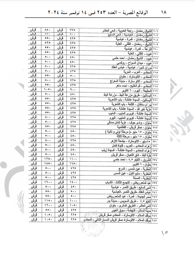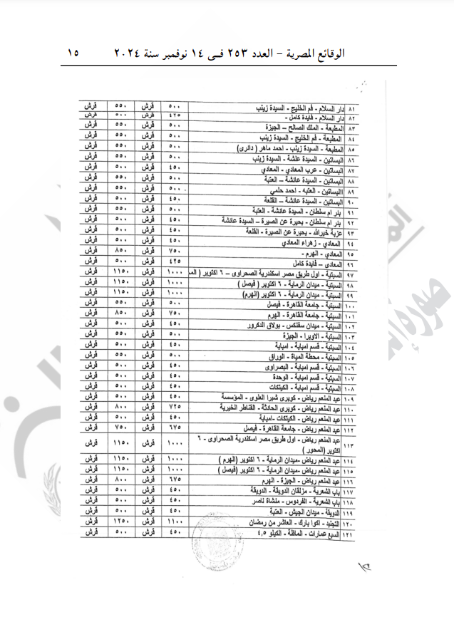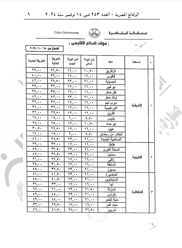 نشرت جريدة الوقائع المصرية في عددها رقم253، الصادر في 14 نوفمبر 2024، قرار محافظة القاهرة رقم 7116 لسنة 2024، بشأن تعديل تعريفة ركوب سيارات الأجرة البيضاء.