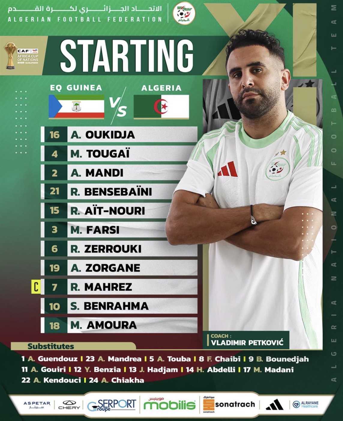 تصفيات كأس إفريقيا 2025، أعلن السويسري فلاديمير بيتكوفيتش المدير الفني للمنتخب الجزائري تشكيل المنتخب اليوم أمام غينيا الاستوائية، ضمن مباريات الجولة الخامسة من المرحلة النهائية لتصفيات كأس أمم إفريقيا 2025.