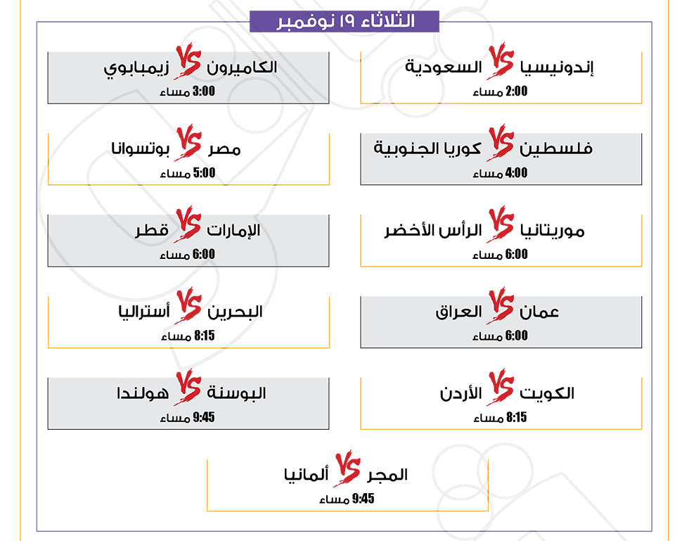 مباريات الأسبوع، منتخب مصر مع بوتسوانا.. الأهلي أمام الاتحاد السكندري.. إيطاليا ضد فرنسا (إنفوجراف) الجمعة 15/نوفمبر/2024 - 05:04 م 11/15/2024 5:04:14 PM منتخب مصر، فيتو محمد سيد شارك طباعة 18 حجم الخط شارك طباعة مصر بوتسوانا إيطاليا الأهلي فرنسا