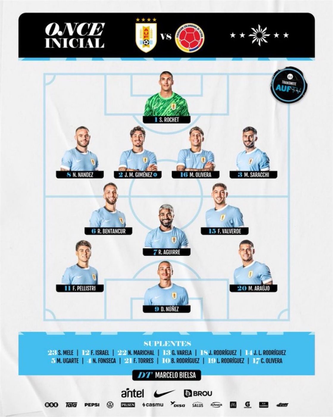 أعلن مارسيلو بييرسا المدير الفني لمنتخب أوروجواي، تشكيل فريقه أمام كولومبيا والتي ستقام على ملعب سنتيناريو، في قمة الجولة 11، بين صاحبي المركزين الثاني والثالث، في تصفيات أمريكا الجنوبية المؤهلة لنهائيات بطولة كأس العالم 2026، المقرر إقامتها بشكل مشترك بين الولايات المتحدة والمكسيك وكندا.