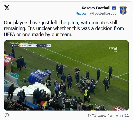 وتوقفت المباراة حتى هذه اللحظة، دون معرفة مصيرها، سواء بإمكانية استكمالها في الدقائق المقبلة أو إلغائها مع إصرار لاعبي كوسوفو على الانسحاب.